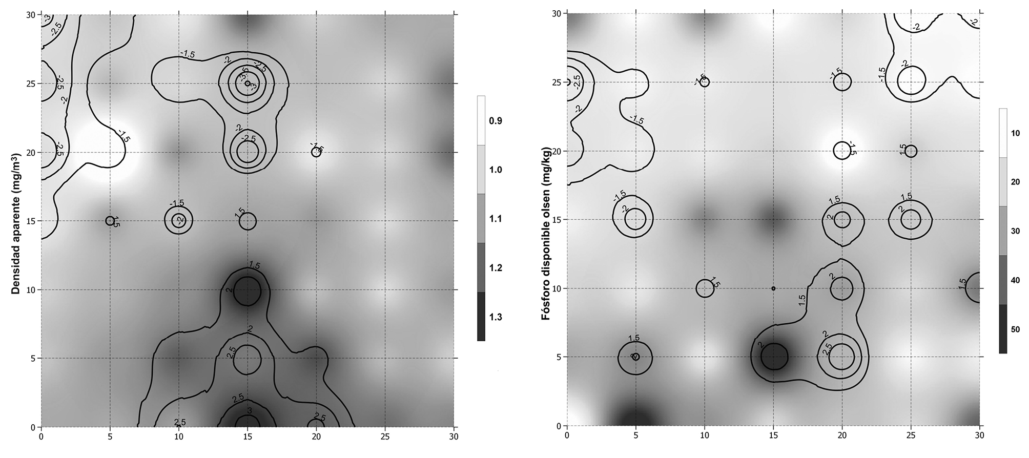 Por un lado, las propiedades del suelo presentaron patrones aleatorios con excepción del fósforo y la densidad aparente. Generalmente el fósforo se comporta en patrones agregados, como lo presentan Jiménez et al. (2011) y Nuutinem et al. (1998). Por otro lado, en los trabajos de Rossi et al. (2006) y Nuutinem et al. (1998), la densidad aparente se comportó de manera aleatoria. Cabe destacar que la densidad aparente es una propiedad que informa sobre la compactación y es influenciada por diversos factores, como el sistema de cultivo, manejo del suelo, macrofauna, entre otros (Porta et al., 2003), por lo tanto, su distribución espacial es muy variable en diferentes condiciones y sistemas de manejo. En los mapas (figura 2) se observan manchas y claros pequeños y dispersos para el fósforo, y grandes agrupadas para la densidad aparente, consistentes con los valores superiores de los índices de agregación (Ia) y agrupación (Uij) de la densidad aparente respecto del fósforo.