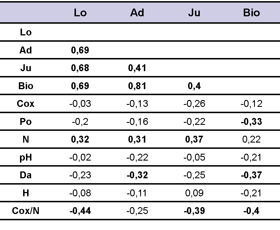 La falta de asociación del carbono orgánico posiblemente se deba al método utilizado, dado que es sabido que el método de rutina de laboratorio evalúa el humus del suelo, es decir, la fracción de carbono orgánico relativamente estable. Las lombrices al presentar una biomasa de fácil descomposición estarían más relacionadas con fracciones lábiles de carbono orgánico como el que se puede calcular por oxidación con permanganato de potasio.