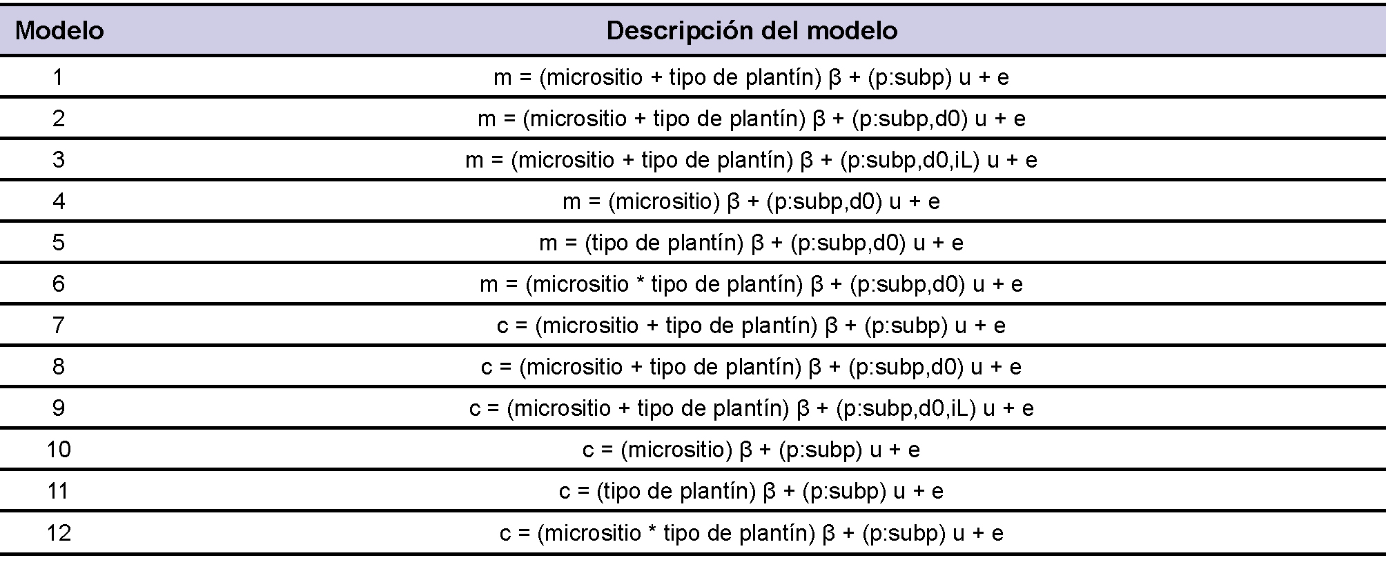 Para analizar los resultados del experimento 2 se ajustaron un conjunto de modelos lineales de efectos mixtos (ecuación 3, tabla 1). Estos modelos establecen una relación entre los factores o variables predictoras (efectos fijos: micrositio y tipo de plantín, efectos aleatorios o covariables: tamaño del plantín “d0” e intensidad lumínica de la unidad experimental “iL”) y las respuestas observadas (mortalidad “m” y/o crecimiento “c”). Además permiten dar cuenta de las variaciones (efectos aleatorios) y/o falta de independencia entre las observaciones, propias del diseño experimental cuando los datos se presentan agrupados, por ejemplo tres plantines dispuestos en un mismo hoyo de plantación (“subp”) y a su vez estos hoyos agrupados por unidad experimental (“p”).
