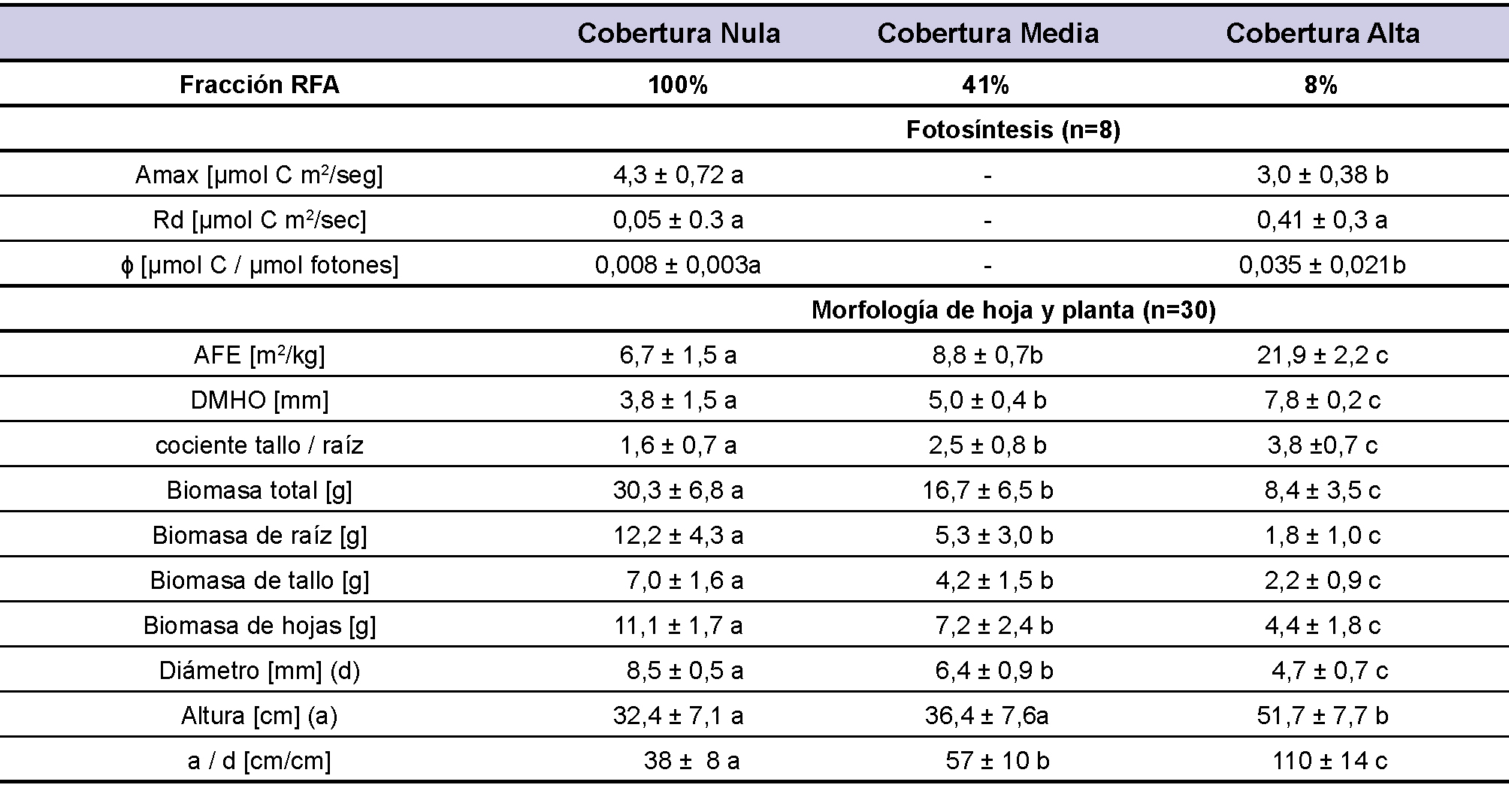 En los dos experimentos, la aclimatación a la intensidad lumínica produjo cambios, tanto en el proceso fotosintético como en la morfología de las plantas. En cuanto a la fotosíntesis, las plantas de cobertura nula del ensayo 1 tuvieron valores de Amax significativamente mayores que los de cobertura alta, pero una eficiencia en el uso de la luz menor (tabla 2, Amax, y ɸ , respectivamente). Estos cambios han sido observados para otras coníferas como Picea abies (Grassi y Minotta, 2000), Picea rubens (Alexander et al., 1995) y latifoliadas como Prunus serotina (Abrams et al., 1992), Acer Sacharum Marsh., y Betula alleghaniensis Britt (Delagrange et al., 2004), esto les permite a las plantas sobrevivir y utilizar de forma eficiente los recursos disponibles.
