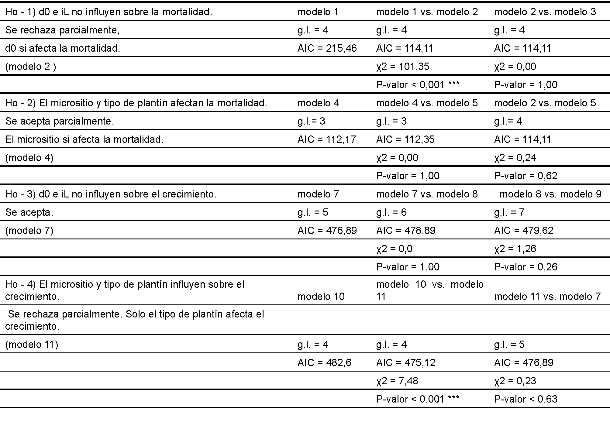 Cada uno de los modelos de la tabla 1 representa una hipótesis en relación con los factores que influyen sobre el comportamiento de los plantines. El proceso de prueba de hipótesis consiste en comparar entre sí dos modelos, donde uno es un caso especial del otro (modelo nulo vs. alternativo) a partir de un test de cociente de verosimilitud (LRT, por sus siglas en inglés Lewis et al., 2011) que identifica cual de ambos modelos comparados representa con mayor exactitud los valores observados.