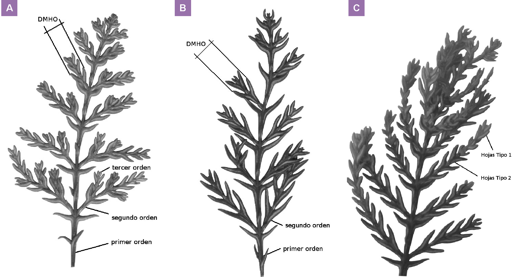 Fotografías de ramillas de plantines aclimatados a la intensidad lumínica. A: en vivero a niveles intermedios de intensidad lumínica (plantín tipo 1), B: en vivero a niveles bajos (tipo 2), C: en vivero a niveles bajos y en plantación a niveles altos de intensidad lumínica. DMHO: distancia máxima entre hojas opuestas. Elaborado para la presente edición.