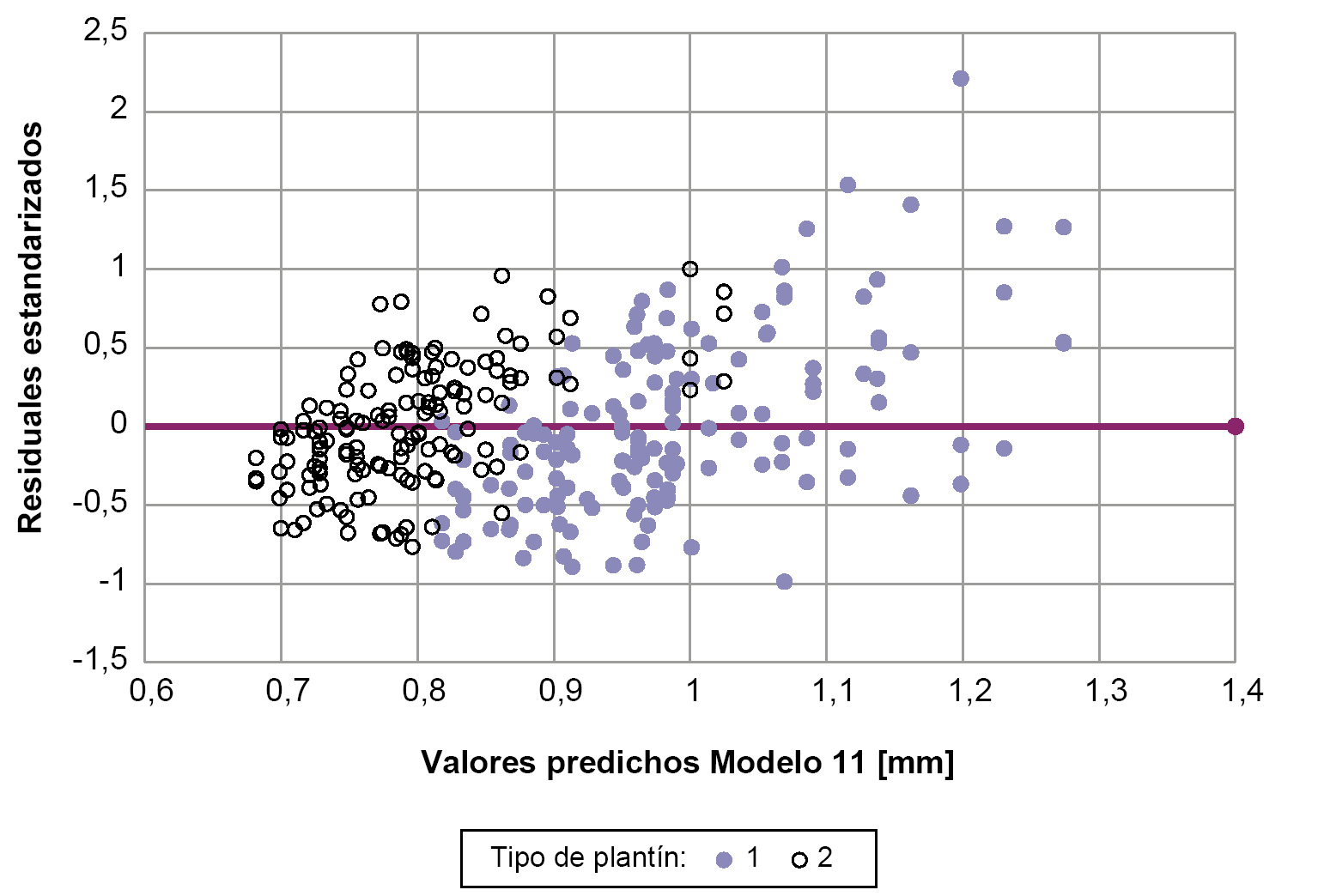 Dispersión de residuales estandarizados versus valores de “c” predichos por el modelo 11, para plantines tipo 1 y tipo 2. Editada para la presente edición.