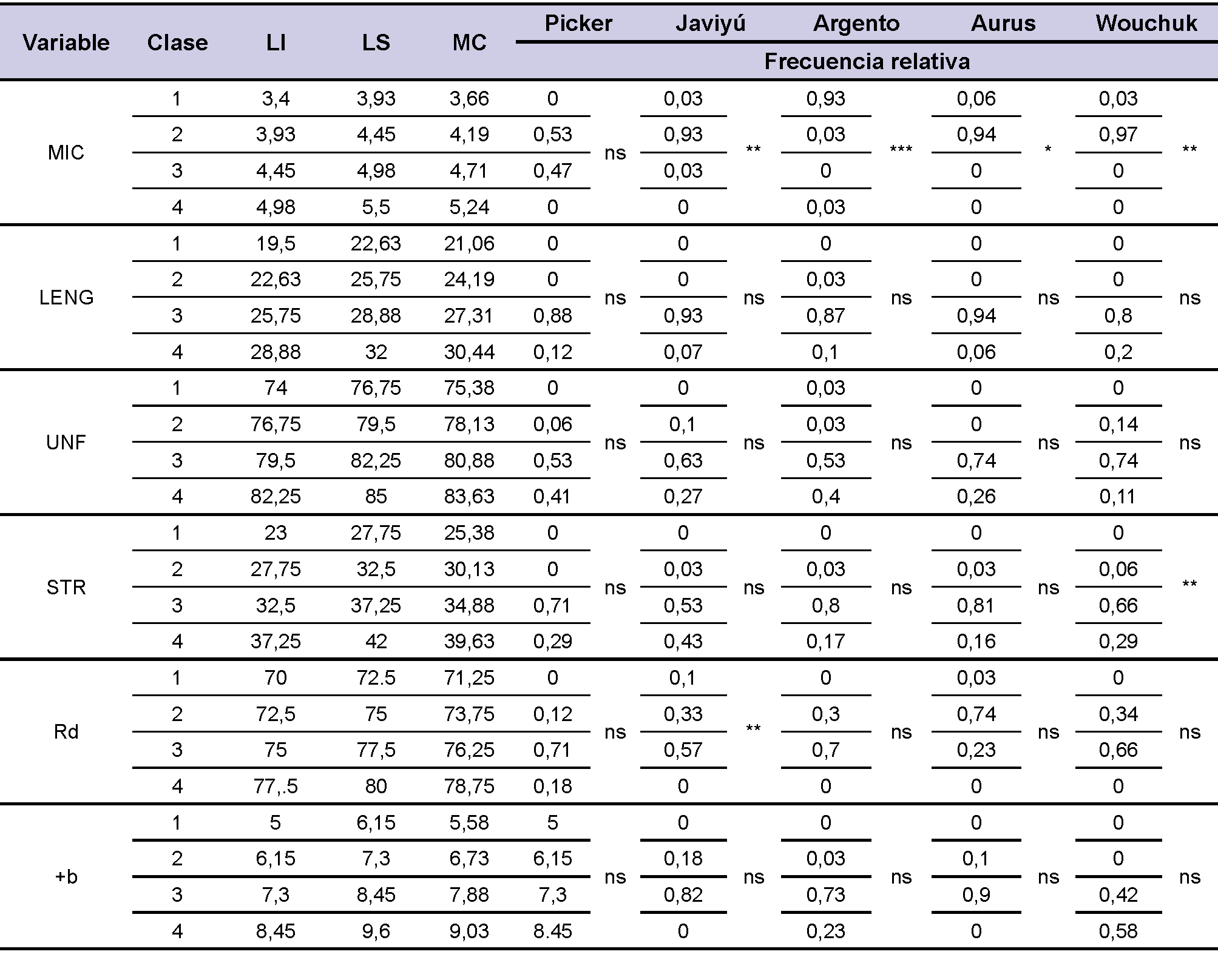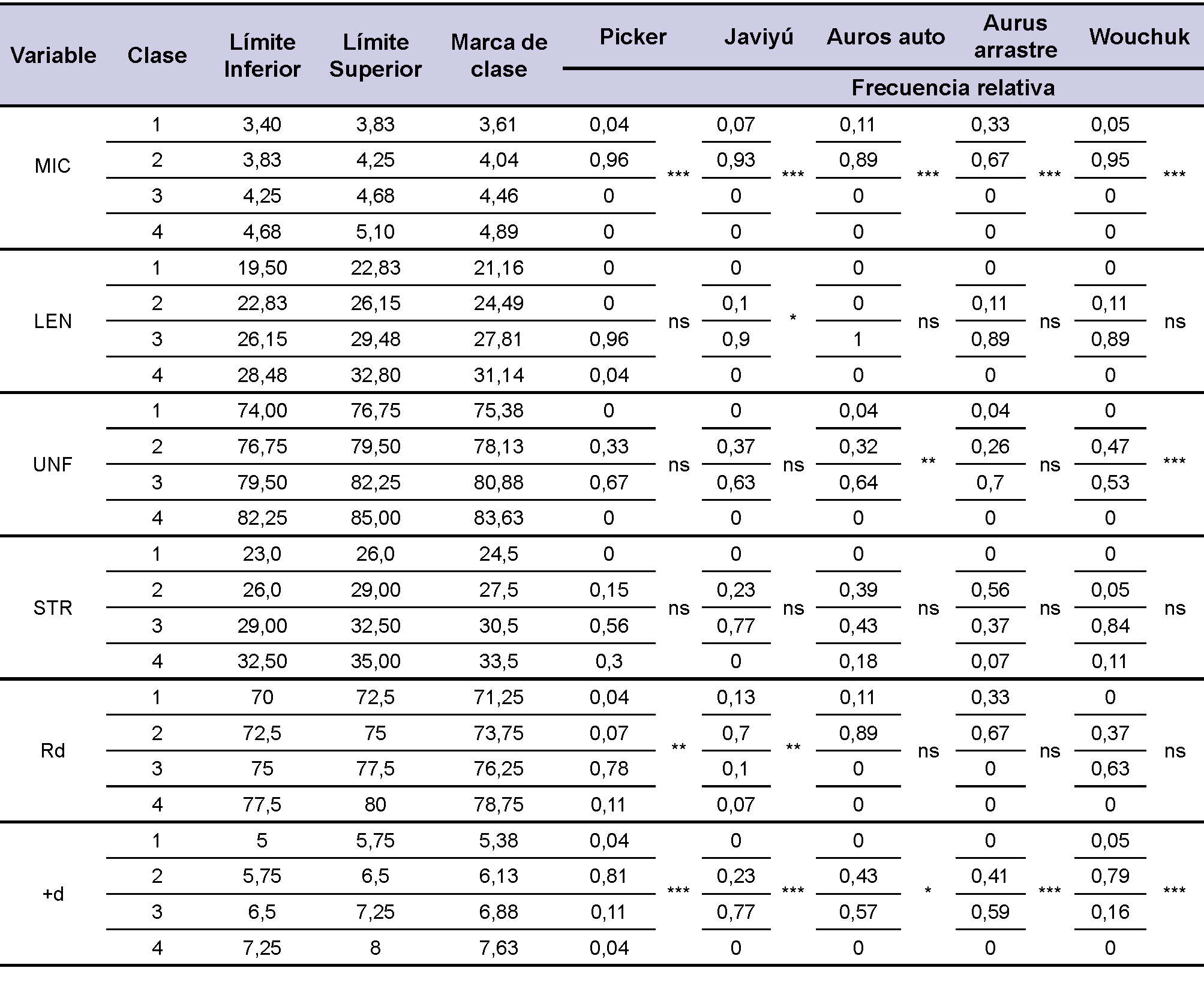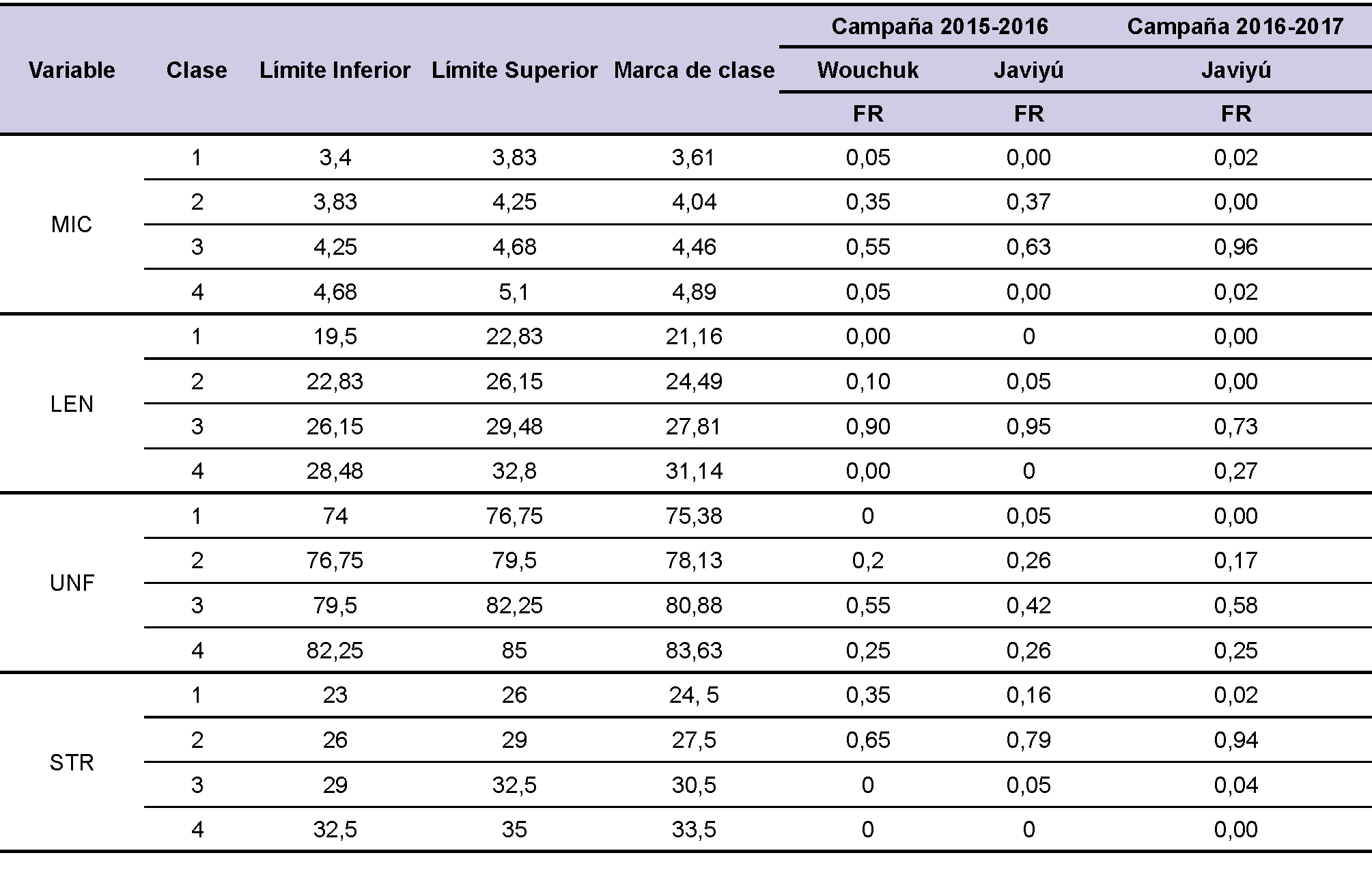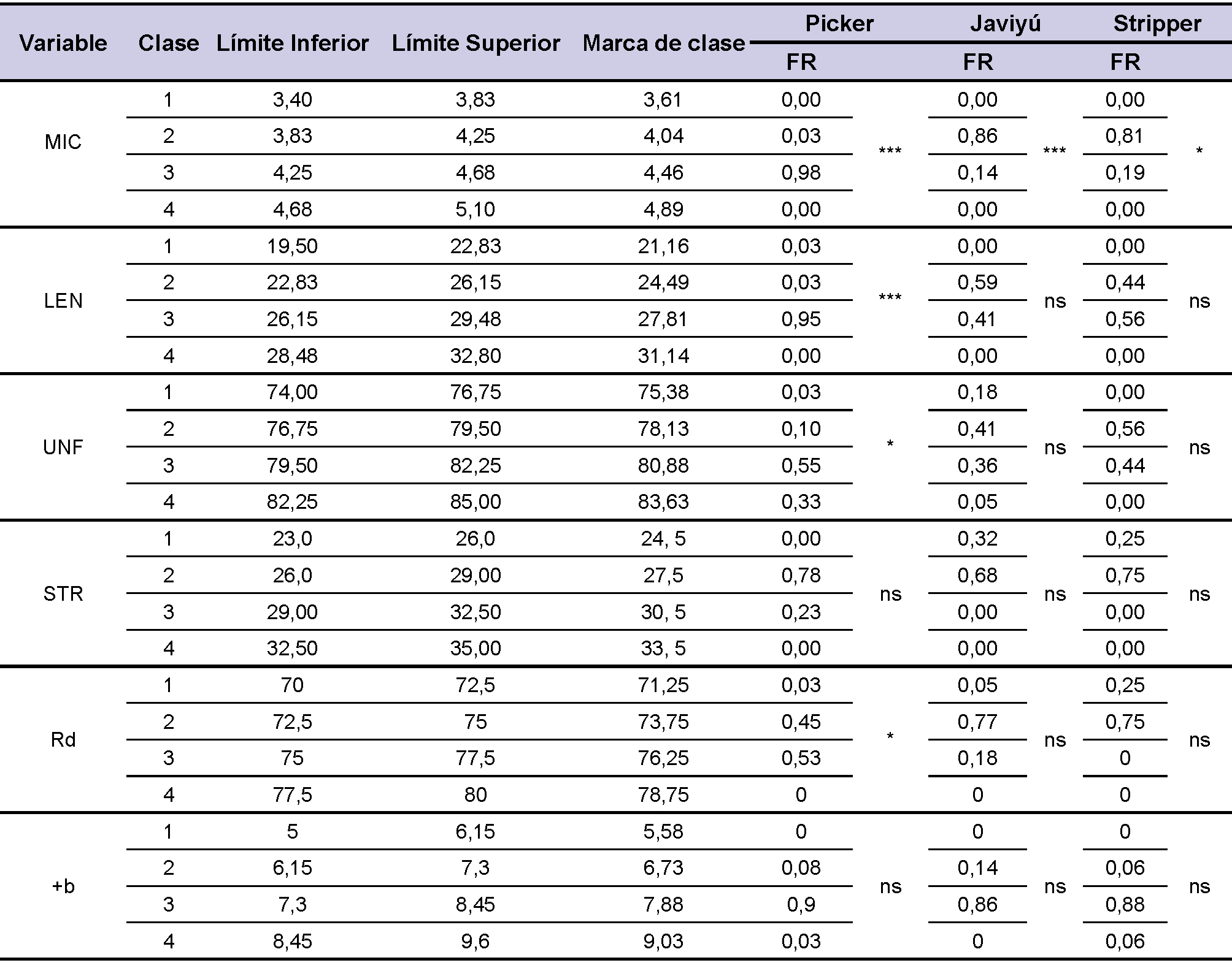Para todas las variables de calidad de los fardos de fibra se construyó una tabla de frecuencias con cuatro clases, y el valor de frecuencia relativa para cada clase, agrupado por parámetro de calidad y sistema de cosecha (Montenegro et al., 2007). Para la evaluación de cambios en la distribución de frecuencias se realizó un análisis de normalidad Shapiro-Wilk para cada parámetro y sistemas de cosecha. Los análisis estadísticos se realizaron con el programa Infostat versión 2011 (Di Rienzo et al., 2010). Se consideró que la cosecha afectó un determinado parámetro de calidad cuando este cambia su distribución de frecuencia respecto a la cosecha picker.