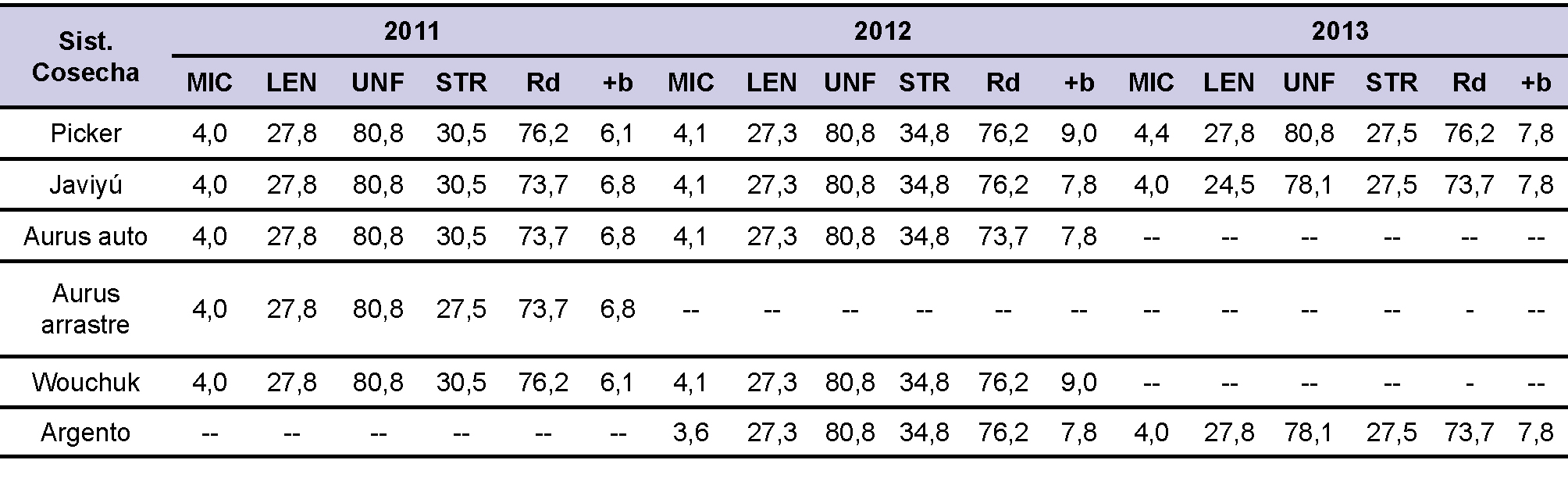Analizando en conjunto el intervalo de clase correspondiente a la mayor frecuencia para los parámetros que determinan la calidad tecnológica de la fibra en las tres primeras campañas se puede observar que el primer y segundo año de ensayos solo hubo cambios en la variable color (Rd) no observándose variaciones en los otros parámetros analizados. En el tercer año de experimentación se observó que el sistema de cosecha tipo Javiyú produjo un incremento de la frecuencia de clase de 24,5 mm de longitud al igual que una reducción en la uniformidad y color (reflectancia); estos dos parámetros también fueron afectados por el sistema Argento (tabla 5).