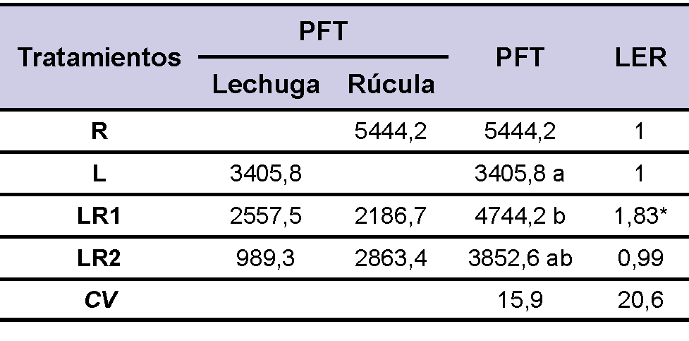 Considerando el PFT, el tratamiento LR1 presentó diferencias significativas respecto de L. Los tratamientos LR1 y LR2 no fueron diferentes estadísticamente entre sí. El valor de LER fue significativamente mayor a 1 en el tratamiento LR1 (tabla 1).