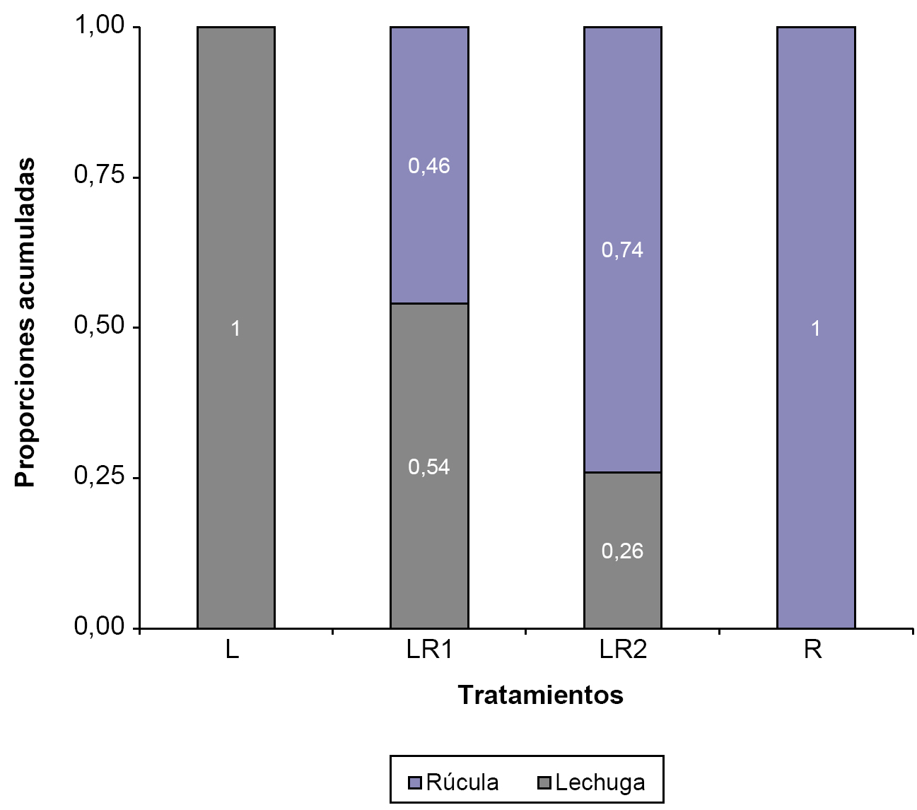 En función a los cambios observados en los rendimientos de cada cultivo en g.m-1, se puede clasificar a los efectos de la interrelación de cultivos en neutros, negativos o positivos. En el tratamiento LR1, ambos cultivos mostraron una relación neutra, ya que los rendimientos de rúcula y lechuga en intersiembra no fueron significativamente diferentes a los obtenidos en los cultivos sembrados solos. Similares resultados fueron obtenidos por Costa et al. (2007), en ensayos de otoño-invierno y de primavera.