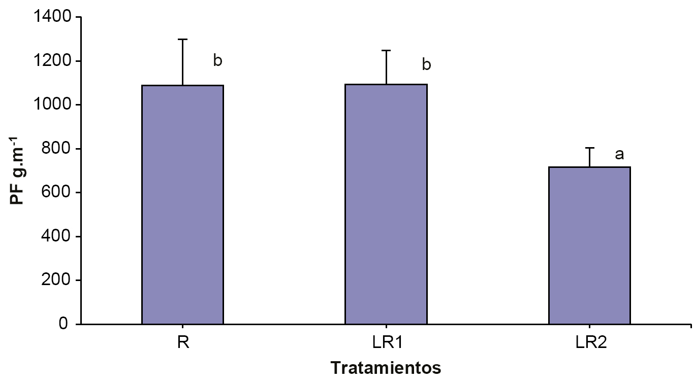 En la figura 2a se expresan los rendimientos de lechuga en g.m-1. El mayor valor se obtuvo como cultivo único (L); sin embargo, ese rendimiento no fue diferente estadísticamente respecto del tratamiento LR1. El menor PF de lechuga fue con LR2; este tratamiento fue significativamente inferior a L y LR1.
