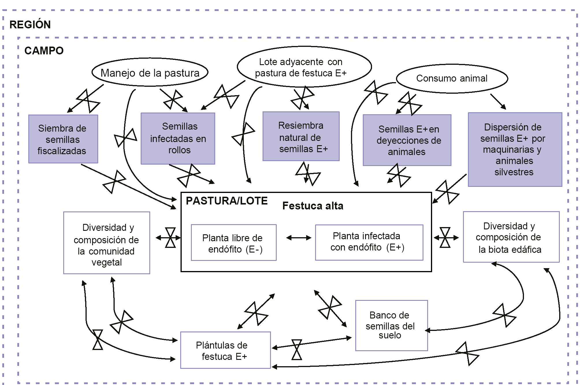 En una pastura de festuca alta con plantas infectadas (E+) y libres de endófito (E-), en estado vegetativo, los animales pueden consumir (Consumo animal) ambos tipos de plantas, pero en general, muestran cierta preferencia por las E-. Ello puede conllevar a que algunas plantas E+ superen en biomasa y producción de semillas a las E-, cuestión que puede verse agravada por un mal manejo (Manejo de la pastura). Las plantas E+ producirán semillas E+ que al no ser consumidas por herbívoros vertebrados e invertebrados (“protección frente a granívoros”) permanecerán en el banco de semillas del suelo con el hongo endófito (Banco de semillas del suelo). En condiciones ambientales adecuadas, estas semillas E+ germinarán y darán origen a plántulas de festuca alta E+, con el concomitante incremento de la densidad de plantas infectadas en la pastura. Este ciclo de contaminación será mayor si se suman las semillas E+ provenientes de otros lotes adyacentes, dispersadas por el viento, animales silvestres, maquinarias, o por el suministro de rollos que contengan semilla E+. De esta manera, se explicaría el rápido incremento del porcentaje de infección en una pastura sembrada con semilla fiscalizada (ej. menos del 5% de infección). Producida la invasión, la rapidez con que la proporción de plantas E+ aumenta dependerá de la diversidad y de la composición de la comunidad vegetal y biota edáfica. Las llaves de control de flujo indican que la relación entre los estados pueden ser modulados por distintos factores o interacciones biológicas. Así, la tasa de aumento de la invasión dependerá del grado de contaminación de las pasturas adyacentes, de la producción diferencial de biomasa y de semillas de plantas E+ y E-, de la preferencia animal y del manejo de la pastura.