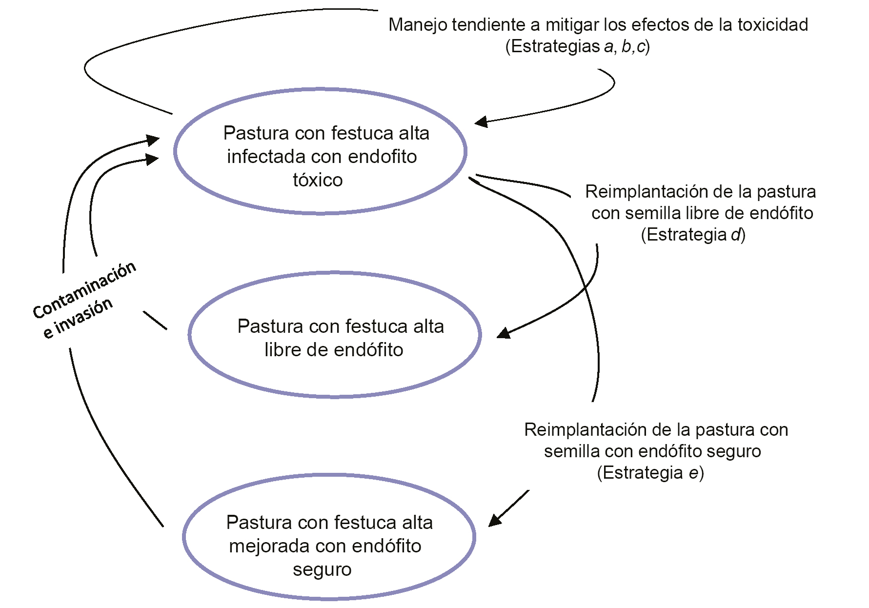 Las principales estrategias de manejo de pasturas orientadas a disminuir el impacto negativo de la festuca infectada con endófito sobre la producción ganadera son (figura 2):