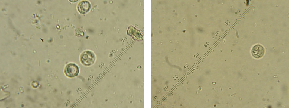 En el 60,7% (17/28) de las heces colectadas se detectaron quistes uninucleados con características morfológicas compatibles con E. polecki: tamaños de los quistes comprendidos entre 8-15 µm, presencia de un solo núcleo con cromatina periférica y nucléolo central (figura 1).