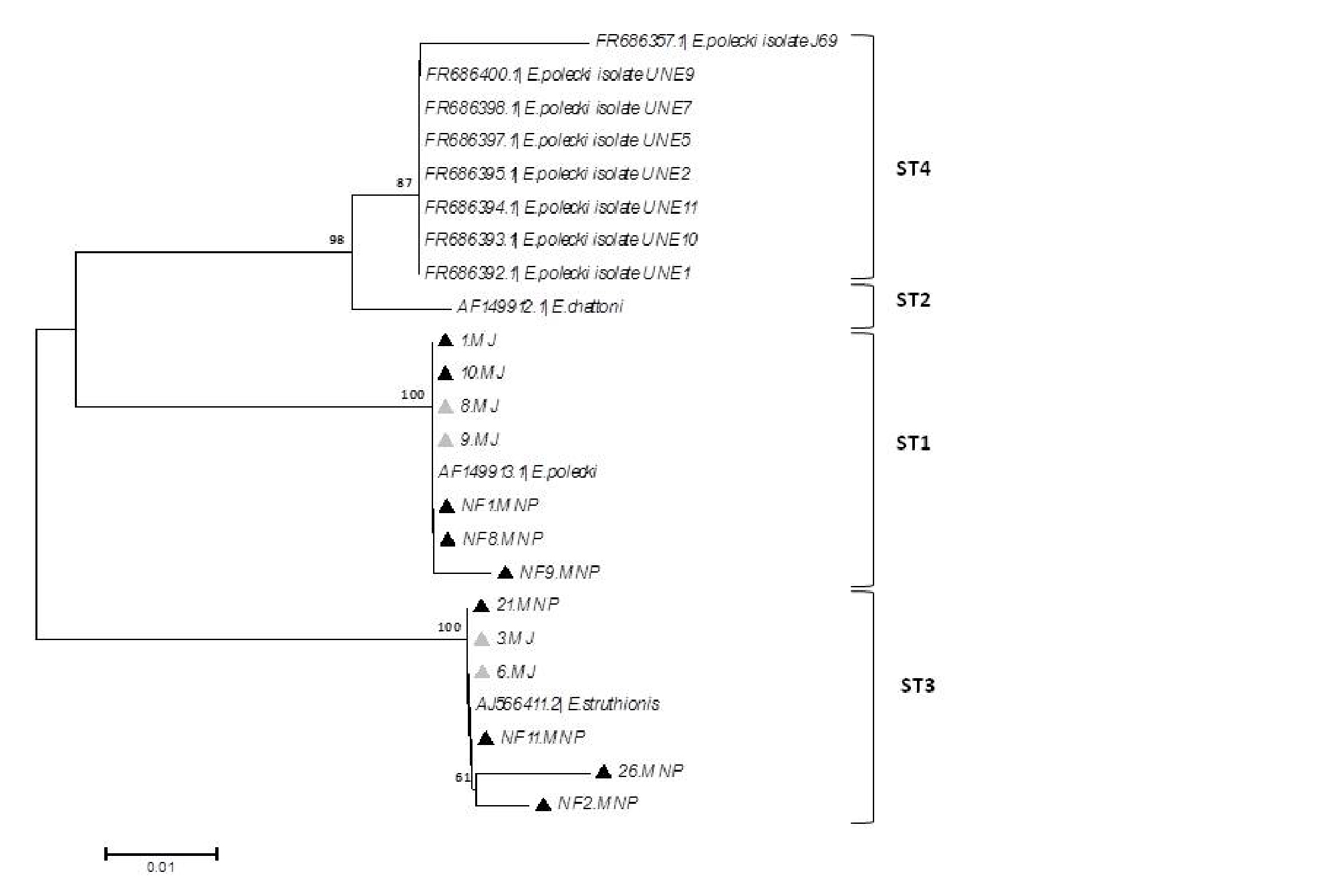 El análisis filogenético permitió clasificar diferencialmente a los aislamientos estudiados, de manera que fue posible identificar dos grupos: E. polecki (ST1) y E. struthionis (ST3) de acuerdo a datos previos (Stensvold et al., 2011). Ningún aislamiento obtenido en este trabajo agrupó con E. chatonni (ST2) o E. polecki (ST4).
