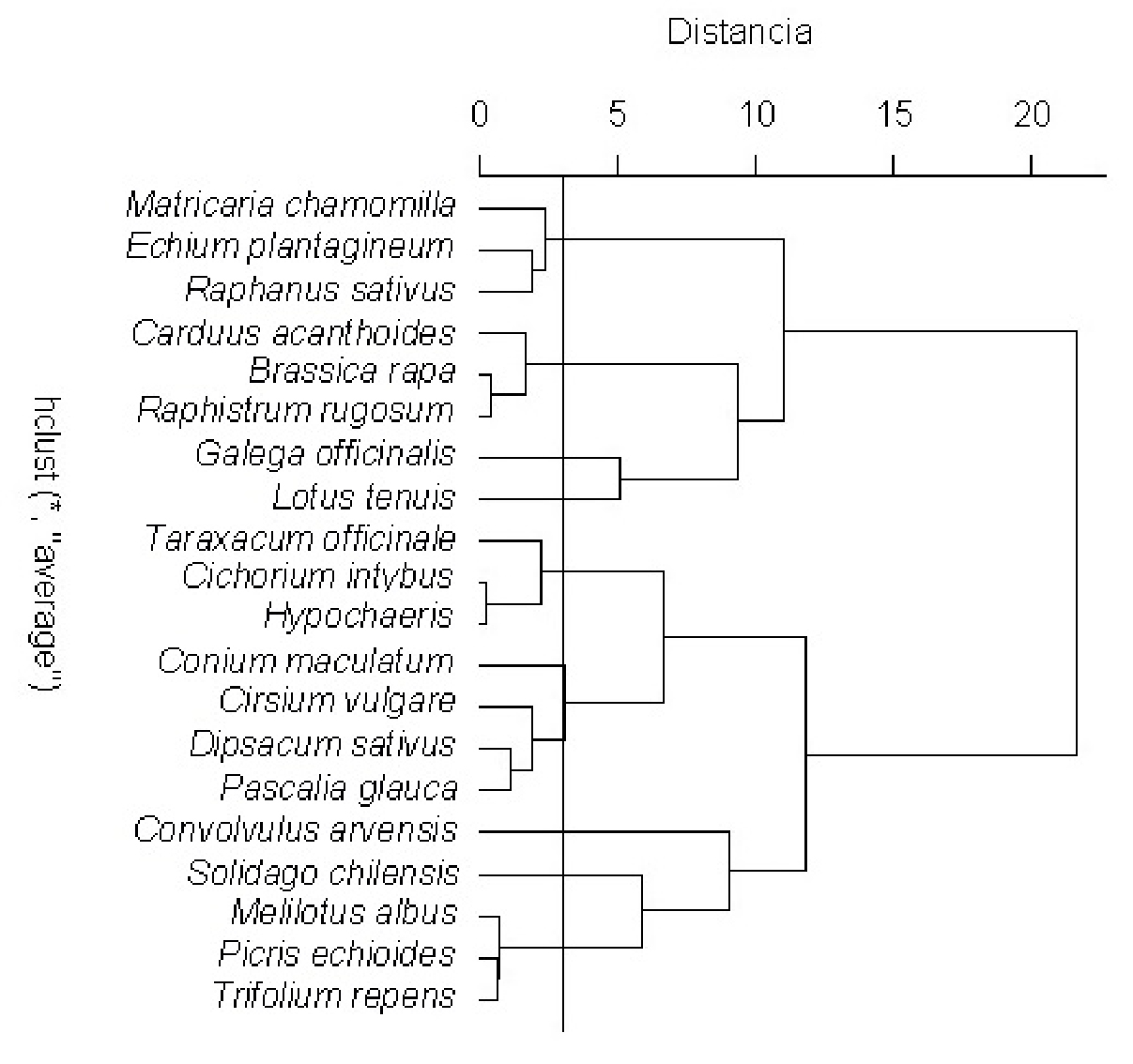 Las especies de riesgo alto serían cuatro para la estación invierno-primaveral (Brassica rapa, Raphistrum rugosum, Raphanus sativus y Echium plantagineum), ocho para la estación estival (las mismas que para la estación previa más Matricaria chamomilla, Carduus acanthoides y Galega officinalis) y cinco para la estación otoñal (B. rapa, R. rugosum, R. sativus, M. chamomilla, y C. acanthoides). La mayoría además habían sido previamente calificadas como HR sensu stricto en la misma zona (Carrizo y Amela García, 2017) lo que justifica su pertenencia a este grupo.