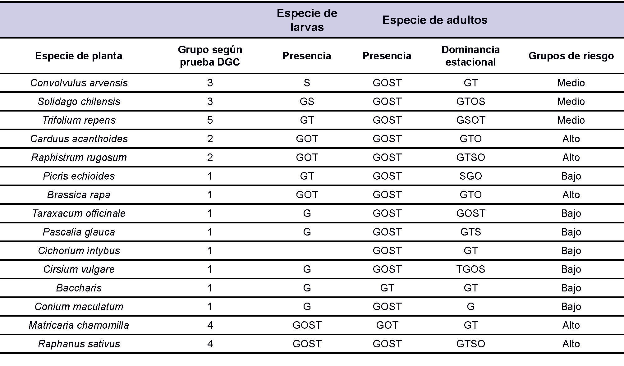 En la estación invierno-primaveral, la inclusión de M. chamomilla en el grupo de bajo riesgo se debió a que se registraron adultos en sus flores en pocas fechas de muestreo en esa época y en ningún caso correspondieron a F. occidentalis. Debido a la baja abundancia relativa de los trips en la estación y siendo una planta de muy bajo porte e inflorescencias pequeñas y de poco desarrollo, es probable que no ofrezca un refugio interesante para esa época, frente a la mayor altura y desarrollo vertical de las inflorescencias en B. rapa, R. rugosum, R. sativus y E. plantagineum, también en flor para la época. Sin embargo, su posición como hospedante de riesgo bajo para la estación temprana y alta para las dos restante implica alguna contradicción. Es una especie muy frecuente en el borde de los cultivos en el exterior de los invernaderos y dado que es Hospedante Reproductiva para F. schultzei (Carrizo y Amela García, 2017) su posición más acertada sería en el grupo intermedio.