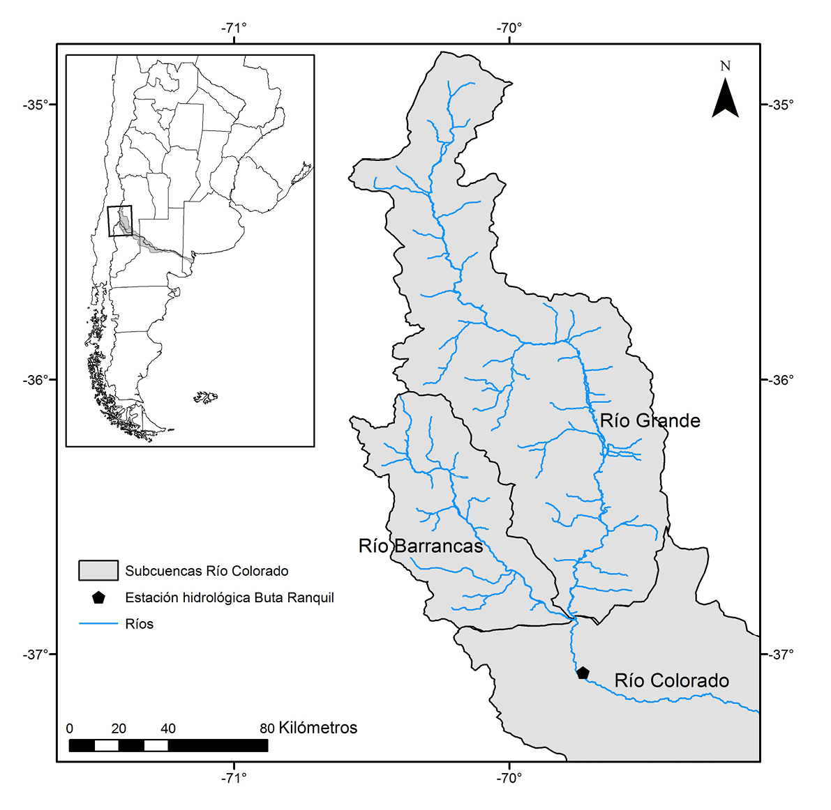 El estudio comprendió las subcuencas de los ríos Grande y Barrancas, principales afluentes del río Colorado (figura 1). Este presenta una marcada estacionalidad primavero-estival, alimentado por la fusión de la nieve acumulada en la Cordillera Principal (COIRCO, 2013). La subcuenca del río Grande se ubica al sur de la provincia de Mendoza, parte oriental de la cuenca alta del río Colorado, con una extensión de 10.405 km2, de régimen nival (Lauro et al., 2016), y un caudal medio anual de 111 m3.s-1. Sobre la porción suroeste de la cuenca del río Colorado se ubica la subcuenca del río Barrancas, entre la provincia de Mendoza y Neuquén, con un área de drenaje de 3.544 km2 y un caudal medio anual de 36,6 m3.s-1 (Subsecretaría de Planificación Territorial de la Inversión Pública y Comité Interjurisdiccional del río Colorado, 2013). Con una superficie total de 13.949 km2, que representa el 29% de la superficie de toda la cuenca del río Colorado, provee agua para el desarrollo de las actividades humanas, agrícolas e industriales que se realizan en la parte media y baja de la cuenca.