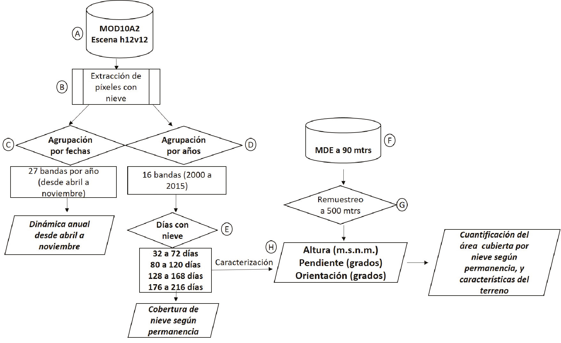 Diagrama de la metodología utilizada para obtener información de cobertura nival a partir del producto MOD10A2. La información de entrada está representada en discos, las decisiones en rombos, los condicionantes en rectángulos y las series de datos generadas en paralelogramos. Las letras indican los pasos que se siguieron en la metodología que se describen en el texto.