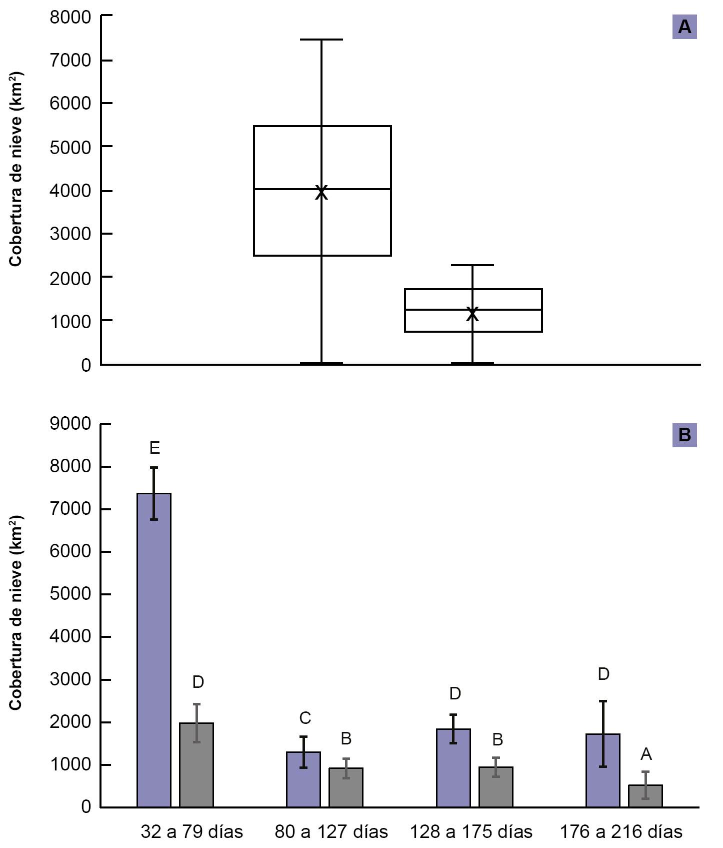 A) Cobertura de nieve en la subcuencas del río Grande y del río Barrancas desde el 23 de abril de 2000 a 17 de noviembre de 2015. B) Cobertura de nieve promedio por clases (días de permanencia) desde 2000 a 2015, y en las barras desvío estándar. Medias con letra común no son significativamente diferentes (p>0,05).