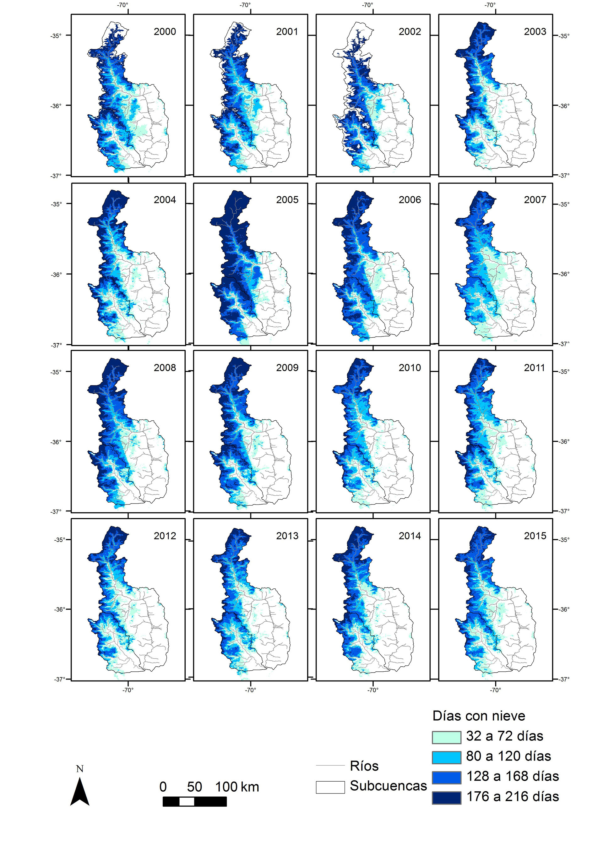En primer lugar, se generó una imagen anual resultante de la agrupación de las 27 imágenes de MOD10A2 de cada año. Para conocer la fecha de ocurrencia de nieve se clasificaron los píxeles con nieve y su fecha de ocurrencia. Solo se extrajeron los píxeles que registraron nieve (valor 200) (figura 2B). Para identificar la marcha anual de la cobertura de nieve se agruparon las imágenes por años para obtener un archivo con las diferentes fechas (figura 2C), generando en total 16 archivos que representan los 16 años bajo análisis (figura 2D) y de 27 bandas cada uno según fechas julianas. Por último, para cada año se agruparon píxeles de acuerdo con el tiempo que estaban cubiertos por nieve (días con nieve), donde cada una de las clases corresponden a: 32 a 72 días, 80 a 120 días, 128 a 168 días y 176 a 216 días (figura 2E). Posteriormente, se calculó el área de cada clase por subcuencas y por año a partir de la cantidad de píxeles.