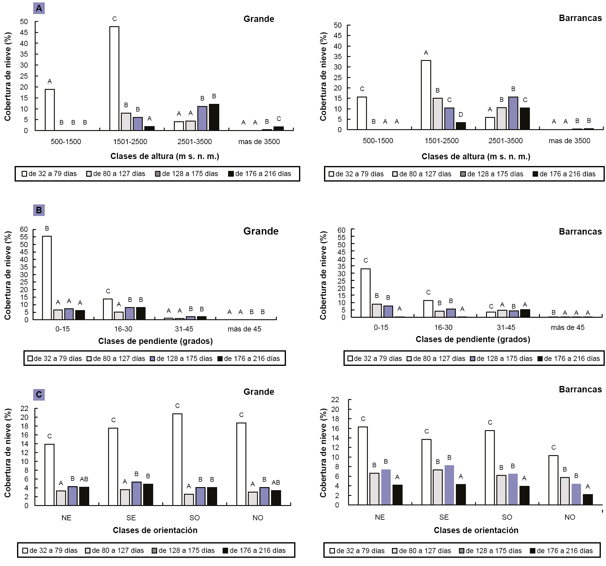En ambas subcuencas, en las laderas con inclinación de 0 a 15° se ubica principalmente la cobertura de nieve de menor permanencia, así también en las laderas con inclinación de 16 a 30o. Por el contrario, las laderas con inclinación superior a 30° albergan escasa cobertura de nieve (figura 5B), existiendo diferencias significativas entre clases (p>0,05). En la subcuenca del río Barrancas un 13% de la superficie con nieve permanece entre 80 y 120 días en laderas muy inclinadas (más de 45°), a diferencia de la subcuenca del río Grande, donde en áreas de esas características la nieve prácticamente no permanece.