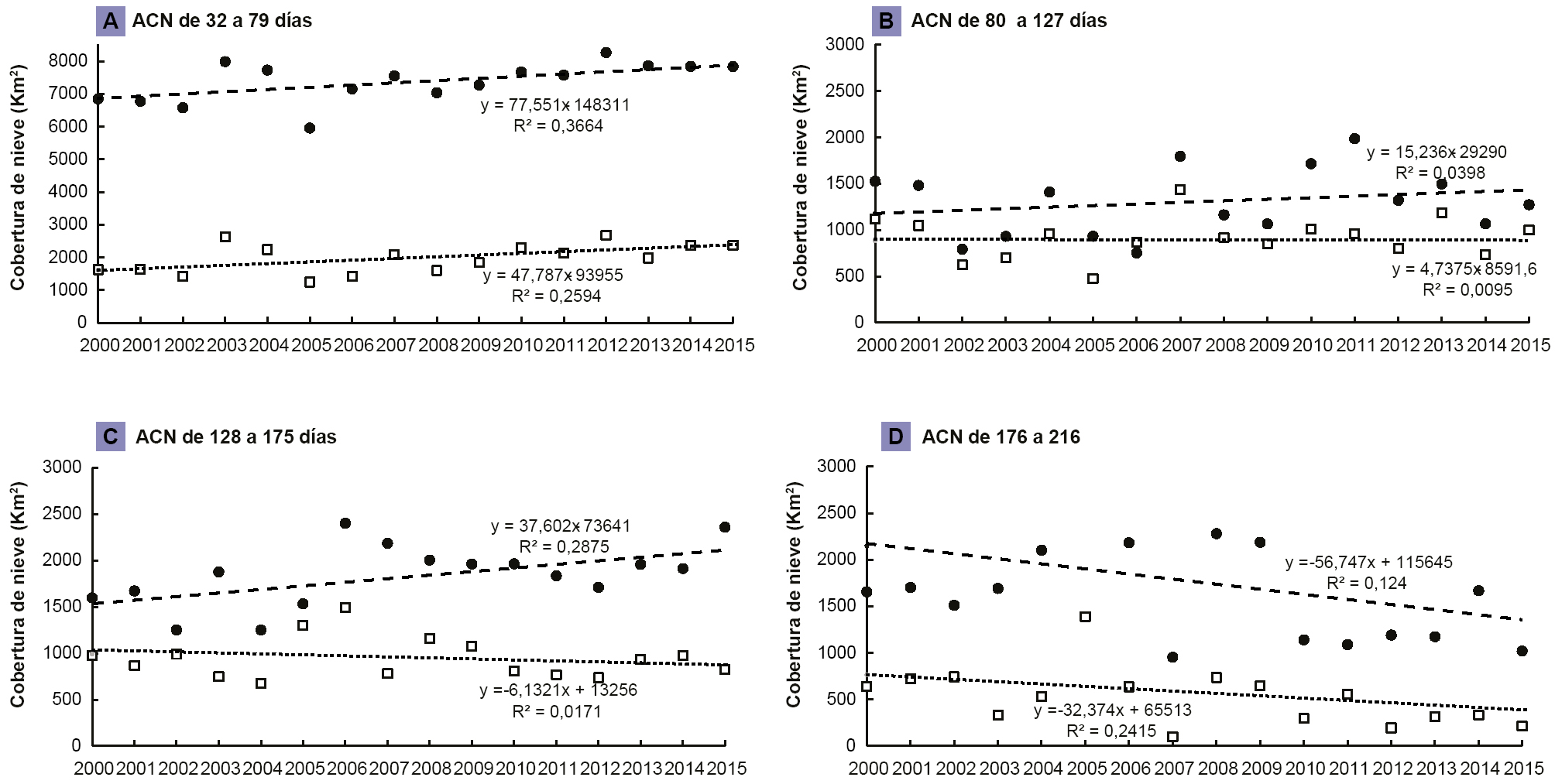 Área cubierta por nieve promedio (km2) por año para cada una de las clases de permanencia. Con círculos negros la subcuenca del río Grande y con cuadrados sin relleno la subcuenca del río Barrancas, y línea de tendencia en cada caso y ecuación de ajuste.