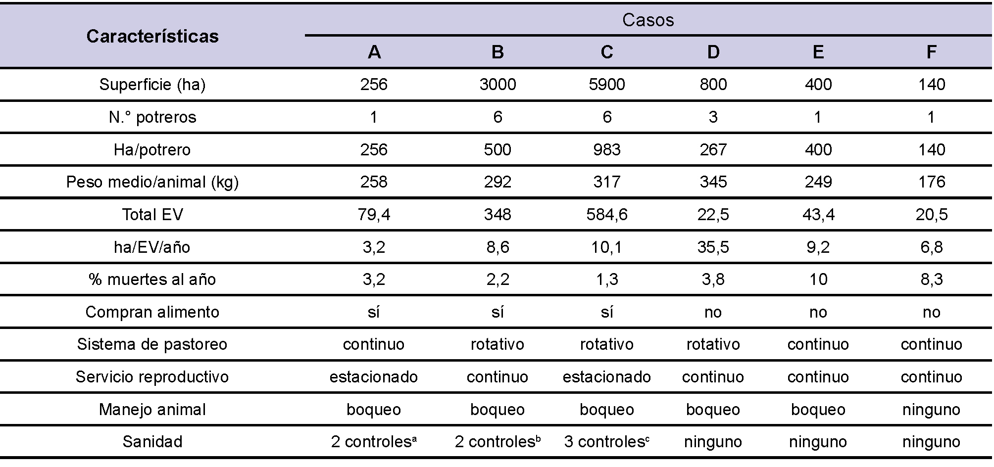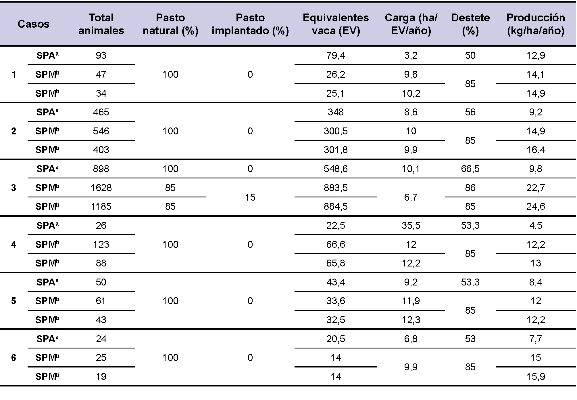 Las principales características de los seis casos del sistema actual (SPA) se detallan en la tabla 1 y están relacionadas con la estructura del sistema y con el manejo del animal. Son sistemas heterogéneos en sus dimensiones (superficie y carga animal), estructura (potreros), manejo del sistema (alimentación, sanidad, servicio, pastoreo) y producción y según investigaciones de Nieto et al. (2018) las seis encuestas seleccionadas para este análisis forman parte de los dos primeros grupos (Grupo i y ii: conformando el 53% de de la muestra). Es importante destacar también que, según el caso, son sistemas con faltante de categorías (sin animales de reposición o vacas de crías viejas), sistema de pastoreo continuo, sistema reproductivo continuo y aplicación de alguna técnica de manejo animal. Son sistemas similares a gran parte de la región (Frasinelli et al., 2003; Riedel y Frasinelli, 2013; Nieto et al., 2014b).