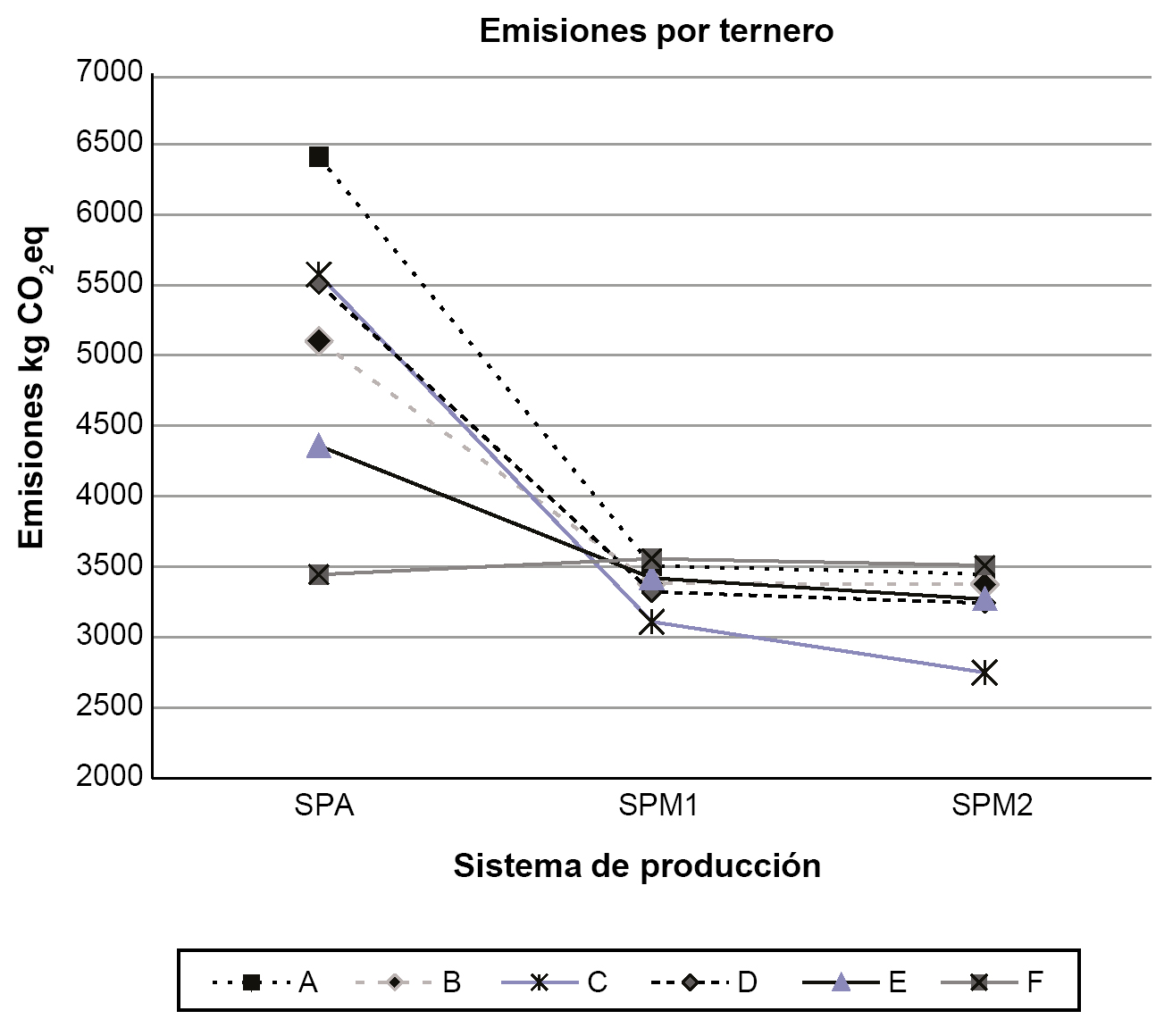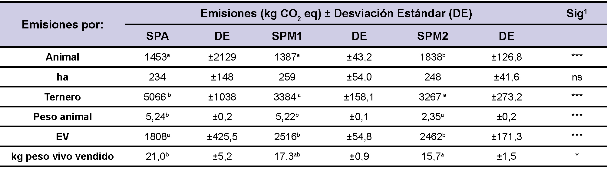 Elaboración propia.En “emisiones por animal” fueron significativamente superiores (P<0,001) en el SPM2 que en el SPA y SPM1 emitiendo estos un 21% y un 24,5% menos que el SPM2. En “emisiones por ternero” fueron significativamente superiores (P<0,001) en el SPA que en los SPM1 y SPM2 emitiendo un 33,2% y un 35,5% menos que el SPA. En “emisiones por peso animal” fueron significativamente superiores (P<0,001) en SPA y SPM1 que en SPM2 emitiendo este un 55,2 y un 55,0% menos de emisiones, respectivamente. En “emisiones por EV” fueron significativamente superiores en SPM1 y SPM2 respecto al SPA emitiendo este último un 28% y un 26,6% menos de emisiones respectivamente. Por último, en “emisiones por kg de peso vivo vendido” fueron significativamente superiores en el SPA respecto al SPM2 emitiendo este un 25,2% menos de emisiones.
