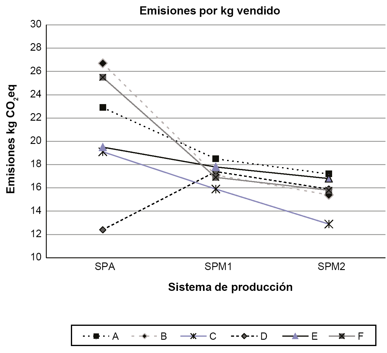 En la figura 1 y en la figura 2 se detallan las emisiones según se estimen por ternero y por kg vendido de los seis casos en sus sistemas actuales (SPA) y mejorados (SPM1 y SPM2). Se puede observar que, con la aplicación de tecnologías de mejora las emisiones disminuyen en todos los casos y en las dos situaciones (SPM1 y SPM2). Así, las emisiones de los casos B y F son los que mayor emisión producen por kg peso vivo vendido, que, con las aplicaciones de tecnologías disminuyen considerablemente sus emisiones. En el caso de F se trata de un sistema que no tiene subdivisiones del campo, no compra alimentos, sistema de pastoreo y reproductivo continuo, no aplica ningún manejo animal ni manejo sanitario.