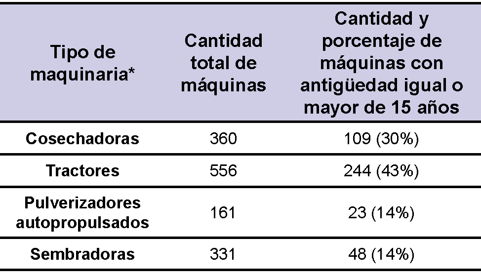 Manifestaron poseer maquinaria agropecuaria propia 542 productores (cosechadoras: 360, tractores: 556, pulverizadores autopropulsados: 161, sembradoras: 331 y otras: 126). Del parque de tractores, el 43% tenía una antigüedad igual o mayor a 15 años, seguidos de las cosechadoras con un porcentaje del 30% y un 14% para las pulverizadoras y sembradoras (tabla 1).