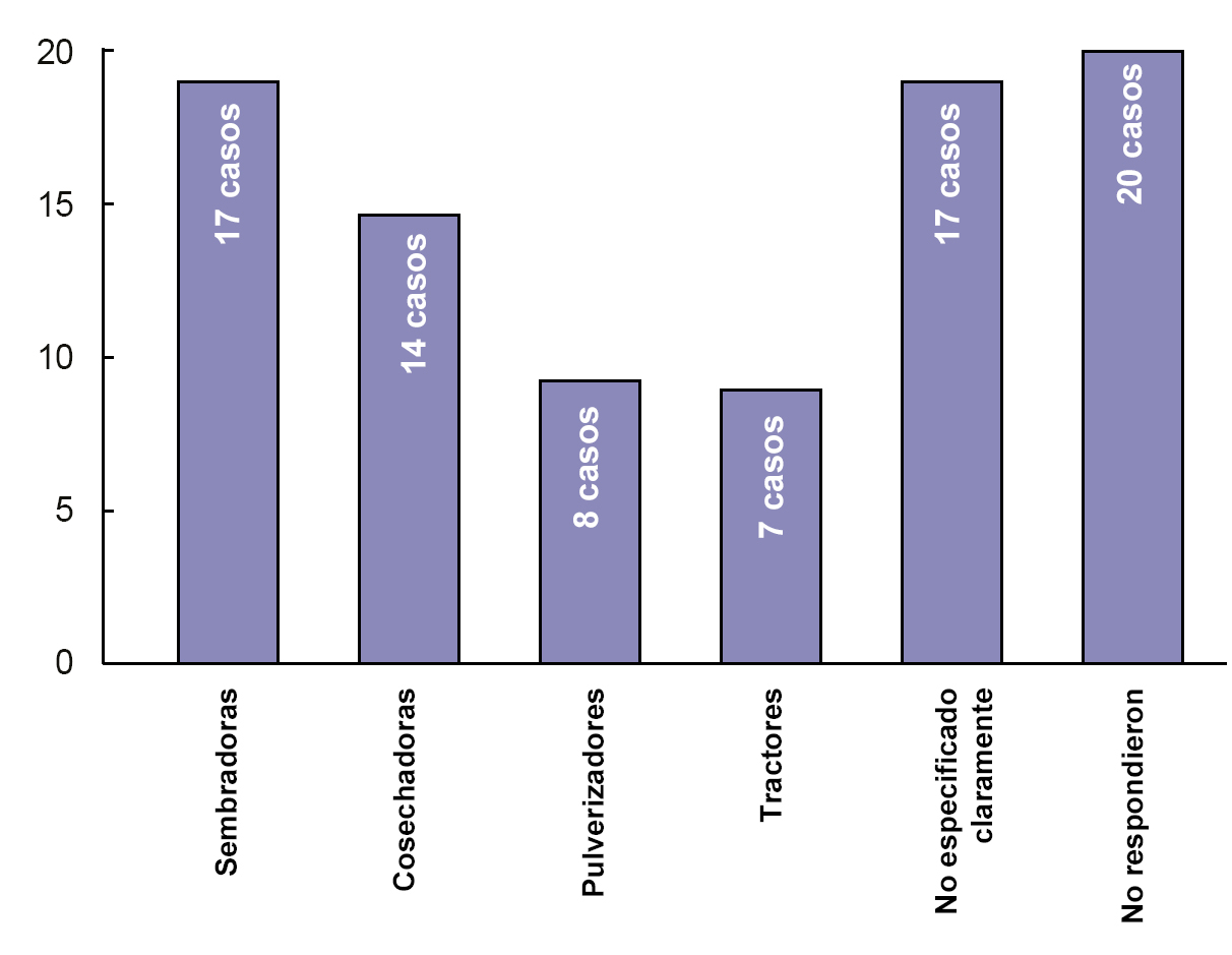 La maquinaria más frecuentemente involucrada en accidentes fueron las sembradoras, seguidas por las cosechadoras. Esto marca una diferencia con muchas investigaciones donde históricamente los tractores han sido los principales agentes involucrados en los accidentes (Svendsen et al., 2014; Nag et al., 2004; Lee et al., 2008; Kennedy et al., 2014; Akdur et al., 2010). Creemos que este punto tiene una radical importancia para futuros análisis.