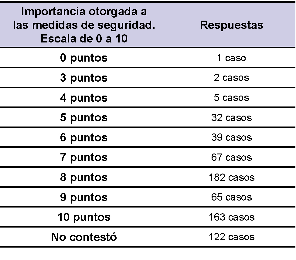 Elaboración propia según información recolectada en este trabajo (2014).Usando una escala de 0 (ninguna importancia) a 10 (máxima importancia), se les solicitó que indiquen la trascendencia que le otorgan a las medidas de seguridad con que llevan adelante las tareas rurales. La mayoría de los encuestados (410 casos) adjudicaron valores entre 8 y 10 puntos (tabla 3).