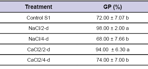 Priming with NaCl or CaCl2 for two days reversed the inhibitory effect of salinity on melon seeds germination, compared to seeds without treatment (Control S1). Increasing treatment duration from 2 to 4 days reduced the favorable effect of the treatments of priming with NaCl and CaCl2 (table 1).