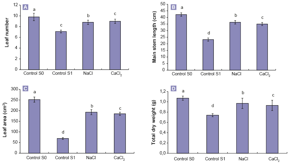 Effect of priming on growth parameters of 40 days-old melon plants: leaf number (A), main stem length (B), leaf area (C), and total dry weight (D). [Control S0: non-stressed plants, irrigated with nutrient solution with 2.0 dS m-1; Control S1: stressed plants, watered with 8.0 dS m-1 nutrient solution; NaCl and CaCl2: plants from primed seed during two days with NaCl and CaCl2 respectively and watered with 8.0 dS m-1 nutrient solution]. Different letters indicate a significant difference (P ≤ 0.05) according to Tukey’s test.