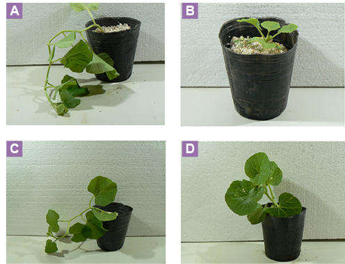 Melon plants of 20 days old. A: Control S0: non-stressed plants, irrigated with nutrient solution with 2.0 dS m-1; B: Control S1: stressed plants, watered with 8.0 dS m-1 nutrient solution; C and D: plants from primed seeds during two days with NaCl and CaCl2 respectively and watered with 8.0 dS m-1 nutrient solution.