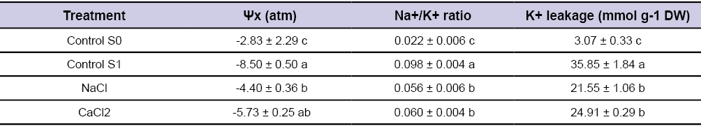 Effect of priming on xylematic potential (Ψx), Na+/ K+ ratio, and K+ leakage. [Control S0: non-stressed plants, irrigated with nutrient solution with 2.0 dS m-1; Control S1: stressed plants, watered with 8.0 dS m-1 nutrient solution; NaCl and CaCl2: plants from primed seed during two days with NaCl and CaCl2 respectively and watered with 8.0 dS m-1 nutrient solution]. Different letters indicate a significant difference (P ≤ 0.05) according to Tukey’s test.