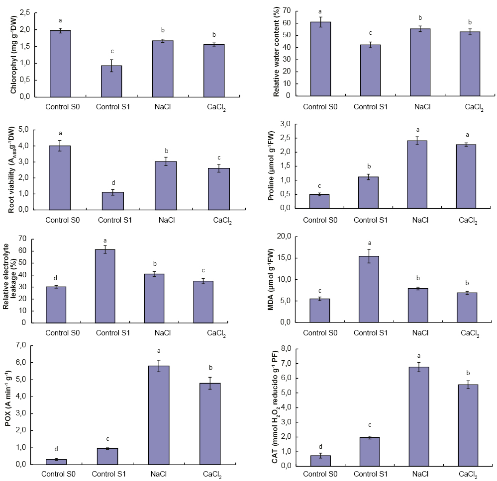 Effect of priming on total chlorophyll (A), relative water content (B) root viability (C), proline (D), relative electrolyte leakage (E), MDA content (F), peroxidase (G) and catalase (H) activity. [Control S0: non-stressed plants, irrigated with nutrient solution with 2.0 dS m-1; Control S1: stressed plants, watered with 8.0 dS m-1 nutrient solution; NaCl and CaCl2: plants from primed seed during two days with NaCl and CaCl2 respectively and watered with 8.0 dS m-1 nutrient solution]. Different letters indicate a significant difference (P ≤ 0.05) according to Tukey’s test.