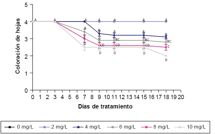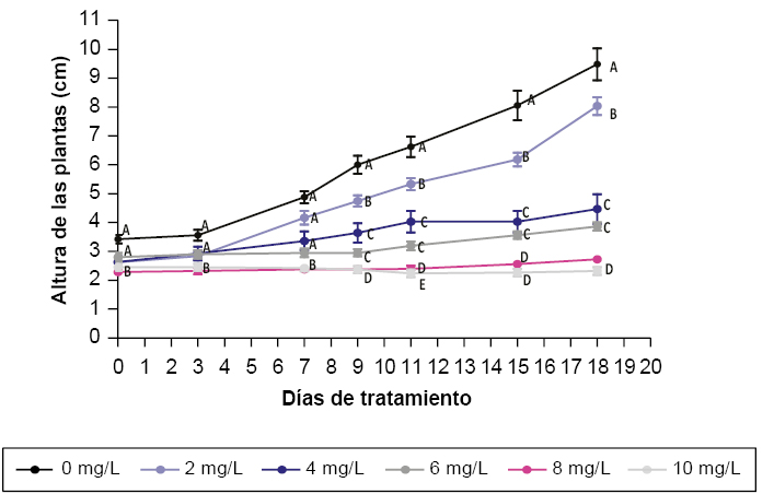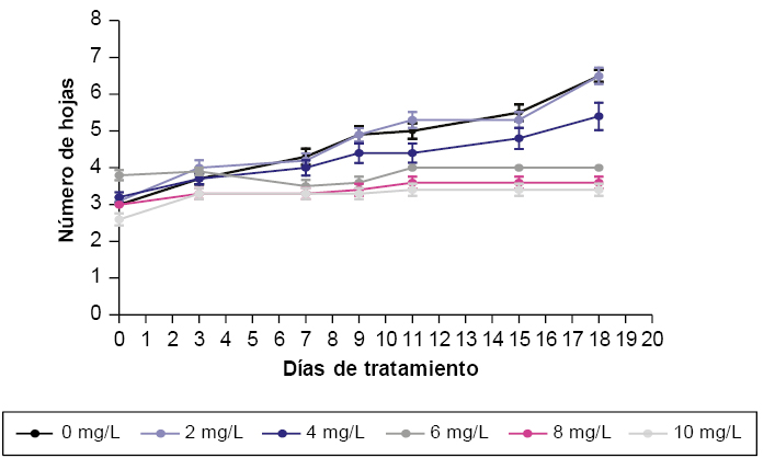 Para el parámetro número de hojas se evaluó el efecto de las diferentes concentraciones de agente selectivo para cada uno de los días de toma de muestra. Las plántulas que crecieron en medio con higromicina 2 mg.L -1 no presentaron diferencias significativas con el control a lo largo del tratamiento (figura 3). Las plántulas que crecieron en medio con higromicina 4 mg.L -1 se diferenciaron del control a partir del día 11, estas diferencias fueron esta dísticamente significativas y se mantuvieron hasta el final del tratamiento. Las plántulas en medio con higromicina 6, 8 y 10 mg.L -1 se diferenciaron del control a partir del día 7. Cabe destacar que no hubo diferencias significativas entre los tratamientos con higromicina 6, 8 y 10 mg.L -1 ya que en ninguno de los tres tratamientos se observó la aparición de hojas nuevas .