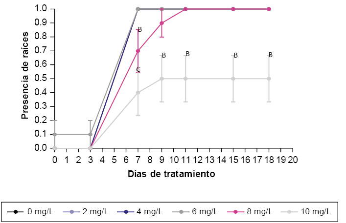 Evolución de la formación de raíz en plántulas de papa sometidas a diferentes concentraciones de higromicina. Los datos son promedio ± error estándar de 10 plantas. 1 indica presencia de raíces, 0 indica ausencia de raíces. Comparación de las diferentes concentraciones de higromicina dentro de cada uno de los tiempos evaluados. Letras diferentes indican diferencias significativas (p<0,05) .