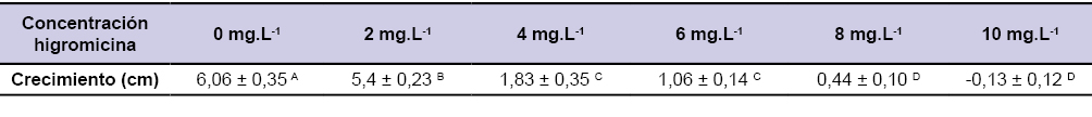 Para el parámetro altura de las plantas se evaluó el efecto de las diferentes concentraciones de agente selectivo para cada uno de los días de toma de muestra. Desde el comienzo del experimento se encontraron que las plántulas presentaban distintas alturas, lo que se observa en las diferencias encontradas entre los tratamientos en el día 0 (figura 4). Es por esta razón que se optó por evaluar el parámetro crecimiento (diferencia entre altura final e inicial) en los distintos tratamientos con higromicina (figura 4, tabla 1). El aumento de la concentración de higromicina afectó en forma negativa el crecimiento de las plántulas (figura 4). Se encontraron diferencias significativas en el crecimiento de las plantas creciendo bajo 2, 4, 6, 8 y 10 mg.L -1 de higromicina .