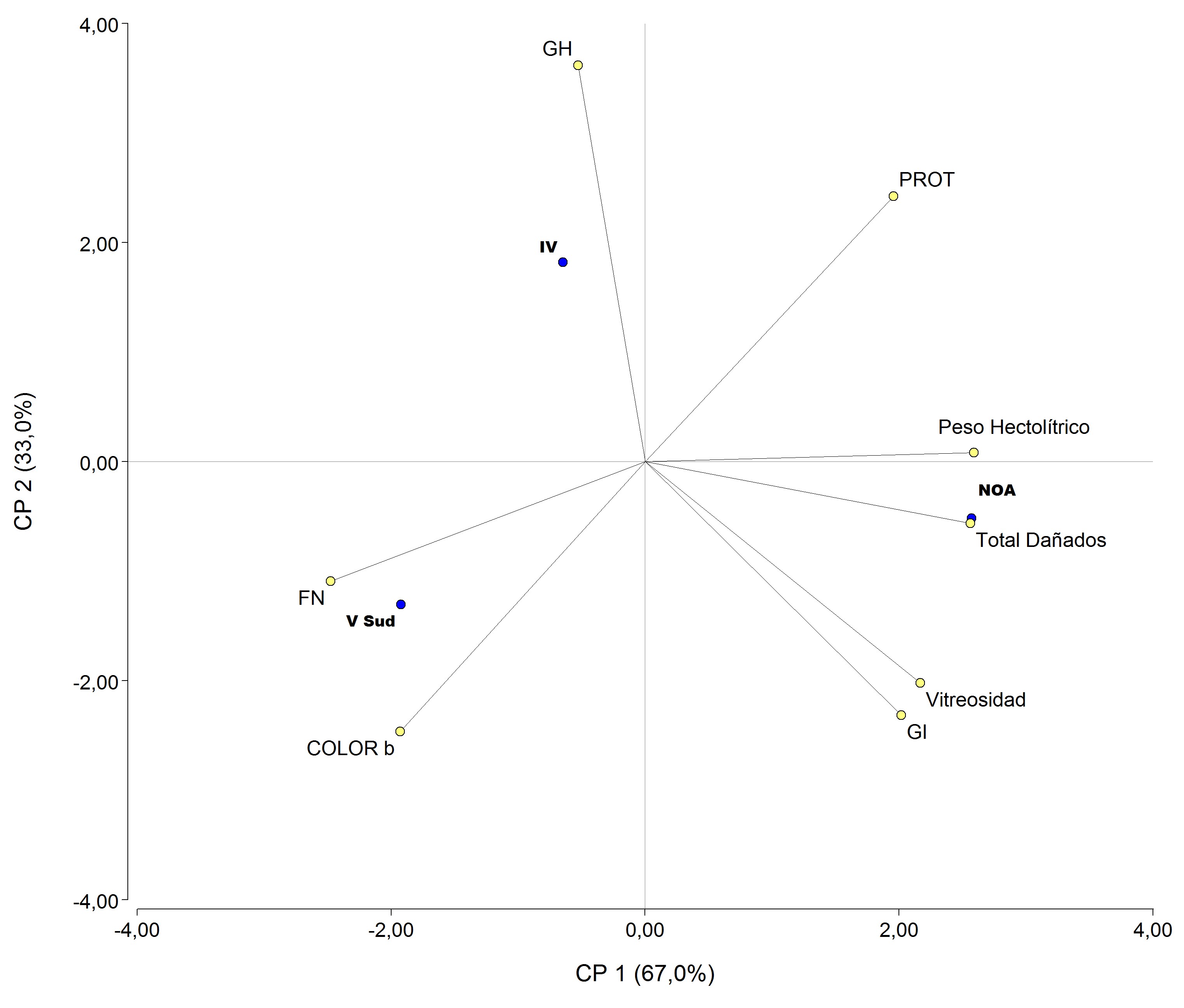 Para conocer la calidad de los trigos producidos en los ambientes acotados y definidos como subregiones iv, v Sud y NOA se realizó un Análisis de Componentes Principales (ACP) sobre algunas de las variables más representativas: Peso Hectolítrico= peso hectolítrito (kg/hl), PROT= porcentaje de proteína (%),FN= Falling Number (segundos), VITREOSIDAD= granos vítreos (%) Total Dañados: granos dañados (%) COLOR b= valor b, GH= gluten húmedo (%), GI= Índice de gluten.