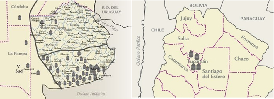 Área de cultivo de trigo candeal. A: Subregiones iv y v. B: Subregión NOA.
