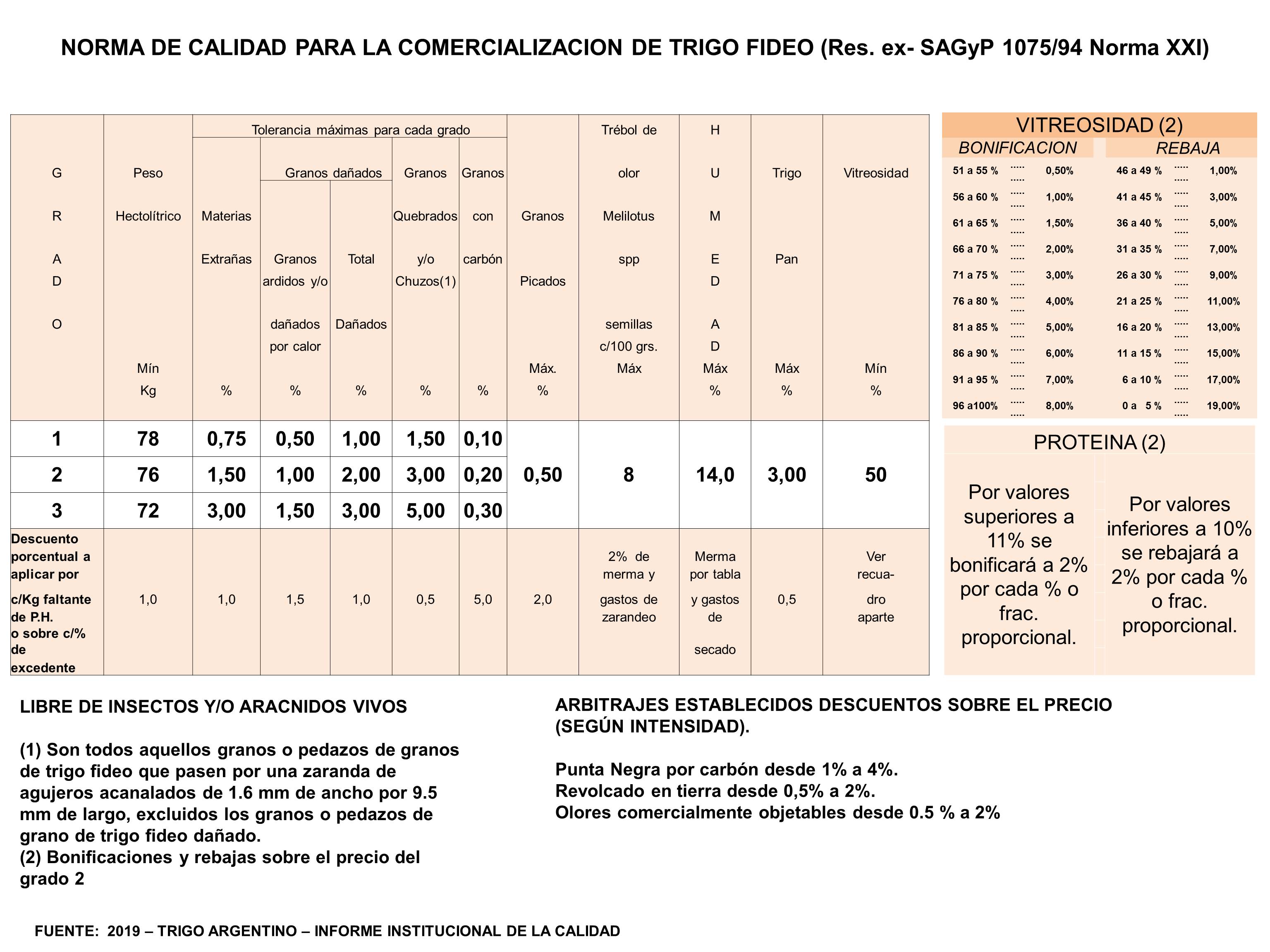 En Argentina para la comercialización existe un sistema de “grados” que son asignados según el resultado que se obtiene sobre una muestra representativa (Norma SENASA xxi, 2019). Sin embargo es una práctica común que cada molino o fábrica procesadora acuerde con el productor un contrato donde aplica bonificaciones o rebajas sobre la base de ciertas escalas fijadas para parámetros de calidad comercial e industrial, tales como: peso hectolítrico, vitreosidad, gluten, proteína e incluso la elección de la variedad, que, por ejemplo, asegura un buen color de sémola.