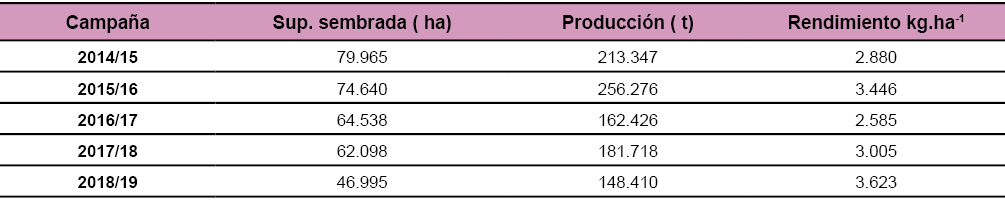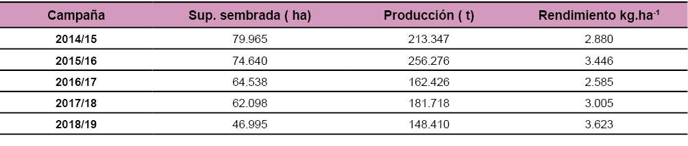 La producción promedio del quinquenio 2014-2019 fue de 192.435 t con una cantidad de 65.647 ha sembradas. El rendimiento promedio en ese período fue de 3.108 kg.ha-1 (SIIA, Estimaciones Agrícolas).