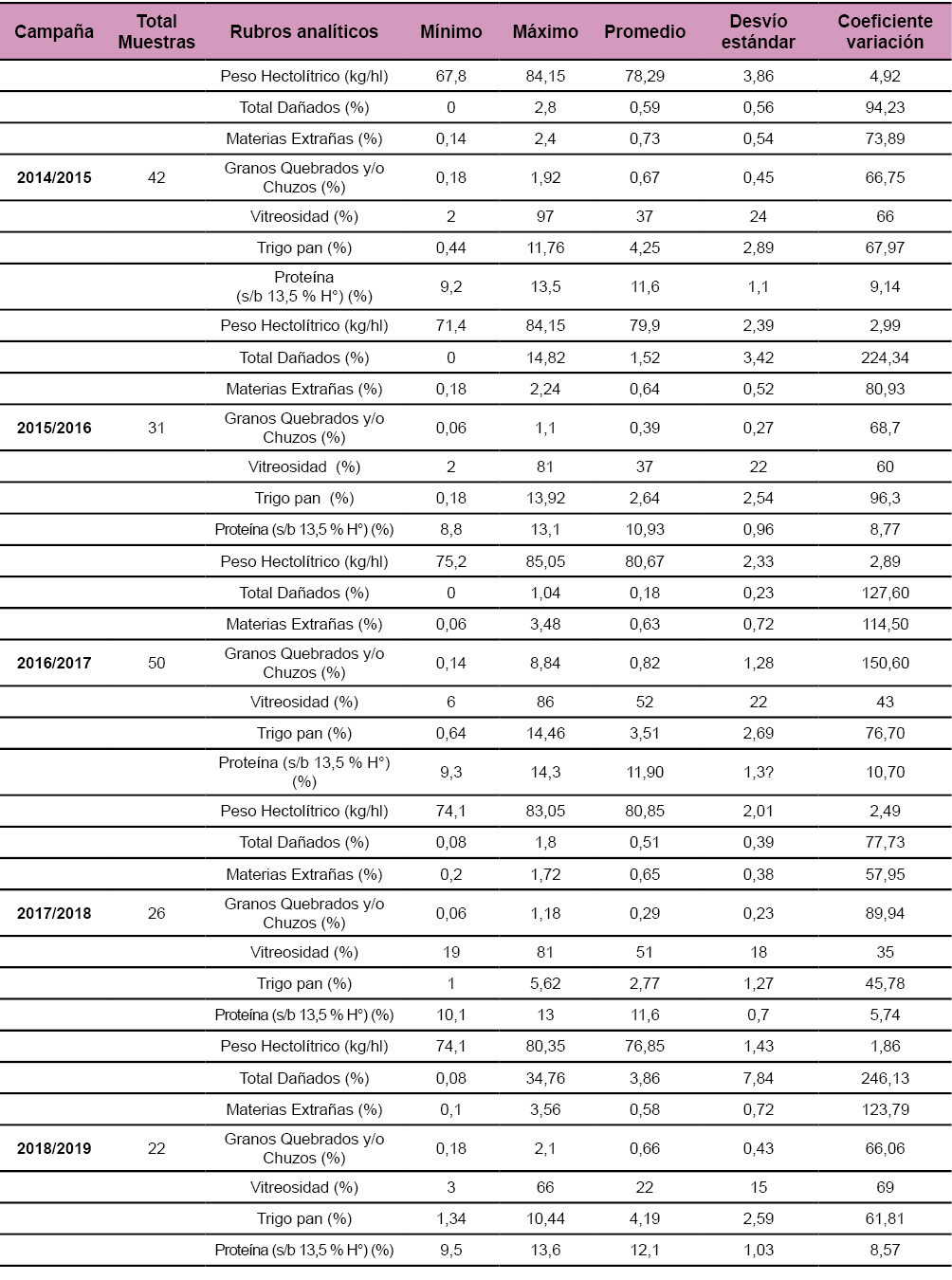 En la tabla 4 se indican los valores mínimos, máximos, promedio, el desvío estándar y el coeficiente de variación en los distintos rubros que definen la calidad comercial del trigo sobre todas las muestras analizadas. El número de estas cambió en función de la producción anual, asociada fundamentalmente a las condiciones climáticas y también al compromiso asumido por los diferentes actores en la recolección de las muestras.
