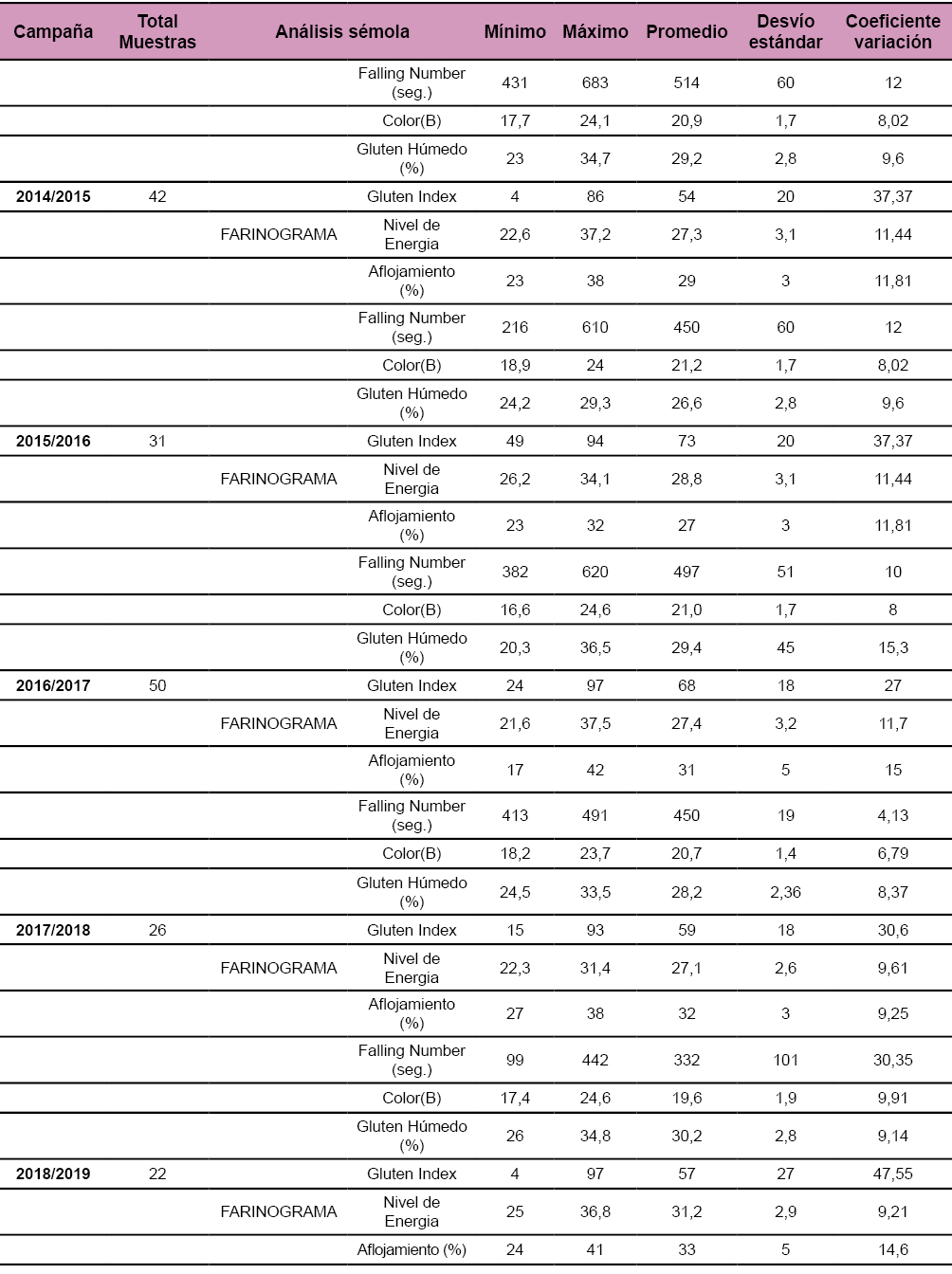 En la tabla 5 se muestran los valores mínimos, máximos, promedio, el desvío estándar y el coeficiente de variación de las características industriales de las sémolas, en las últimas cinco campañas analizadas.