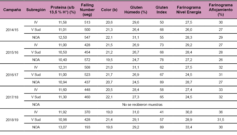 Los aspectos de calidad industrial por zona se ven en la tabla 7. Los resultados mostraron que en condiciones de cultivo a campo los trigos tuvieron adecuado Falling Number, excepto en el NOA en la última campaña, cuestión ya desarrollada y por consecuencia de los granos brotados.