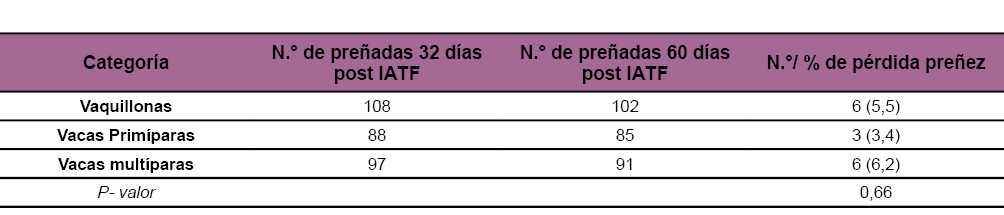 Pérdida de preñez en vaquillonas, vacas primíparas y vacas multíparas entre un primer diagnóstico de gestación por ultrasonografía al día 32 post IATF y un segundo diagnóstico de gestación por ultrasonografía al día 60 post IATF.
