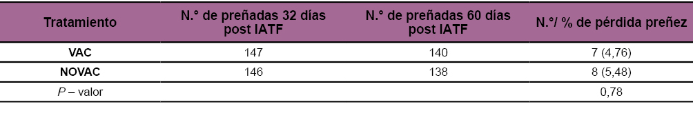 Pérdida de preñez entre un primer diagnóstico de gestación por ultrasonografía al día 32 post IATF y un segundo diagnóstico de gestación por ultrasonografía al día 60 post IATF, vacunadas (VAC) contra el virus de la fiebre aftosa el día 32 de gestación y no vacunadas (NOVAC) contra el virus de la fiebre aftosa.