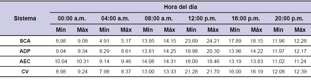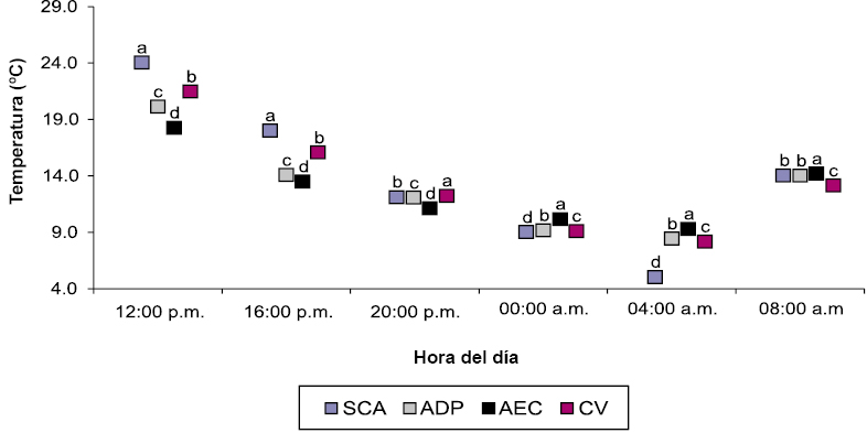 Por un lado, las temperaturas promedio registradas a las 12:00, 16:00, 20:00, 00:00, 04:00 y 08:00 evidenciaron diferencias significativas (p<0,05) entre el SCA y los arreglos con CV, ADP y AEC (figura 1); en los resultados registrados a las 12:00 se observan diferencias de 2,57 °C, 3,93 °C y 5,79 °C respectivamente con relación al SCA. En ese sentido, las mayores temperaturas para los registros realizados entre las 12:00 y 16:00 se obtuvieron en los SCA, aunque entre las 00:00 y las 08:00 se evidenció una mayor temperatura en el arreglo con AEC. Por otro lado, los registros realizados indican que el arreglo con AEC fue el sistema donde se presentaron las temperaturas más bajas entre las 12:00 y 20:00; en tanto, entre las 00:00 y 04:00 fue en el SCA donde se registraron temperaturas inferiores (tabla 1).