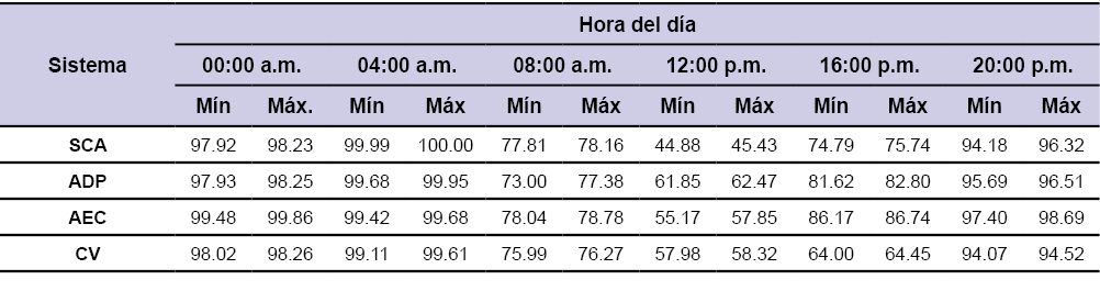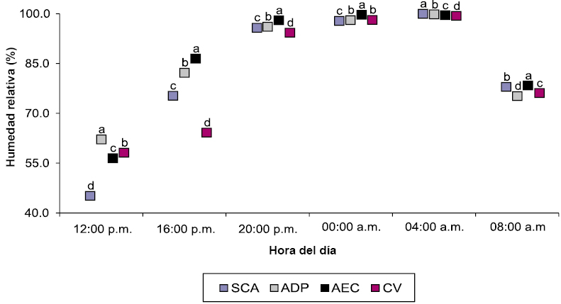 En relación con la humedad relativa (HR) registrada a las 12:00, 16:00, 20:00 , 00:00, 04:00 y 08:00, los ASP y el SCA presentaron diferencias estadísticas significativas (p<0,05) (figura 2). El resultado obtenido a las 12:00 fue superior en el arreglo con ADP, pero entre las 16:00 y las 00:00 fue el arreglo con AEC el sistema en el cual se registraron los niveles más altos de HR. En horas de la mañana el mayor porcentaje de HR se registró en el SCA (04:00) y en el arreglo con AEC (08:00). Por su parte, en cuanto a los niveles más bajos de HR estos se registraron en los SCA y el arreglo con CV, a excepción del registro realizado a las 04:00 donde fue el SCA quien presentó el porcentaje más elevado de HR en comparación con los demás sistemas evaluados (tabla 2).