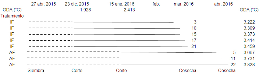 Referencias: líneas punteadas indican el tiempo desde la siembra al corte, las líneas llenas indican el tiempo desde el corte a cosecha, IF y AF, momentos del corte al inicio y avanzada la floración, respectivamente. La cosecha del mes de marzo se realizó entre los días 3 y 21, y la de abril entre los día 5 y 22; GDA, grados días acumulados.